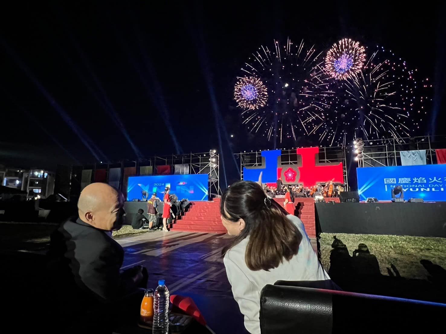 雙十國慶焰火秀,百年來首度移師雲林,不僅總統賴清德到場,「雲林女婿」、立法院長韓國瑜也帶著妻子李佳芬共襄盛舉。韓國瑜以慶籌會主委身分上台致詞,為中華民國生日許下3個願望,一是國泰民安,二是提高雲林關注度,第三是希望以武術聞名、西螺七崁出身的李佳芬,「不要再拔我頭髮了,我毛髮已經不多了!」李佳芬掩面又氣又笑,現場觀眾則被逗樂。