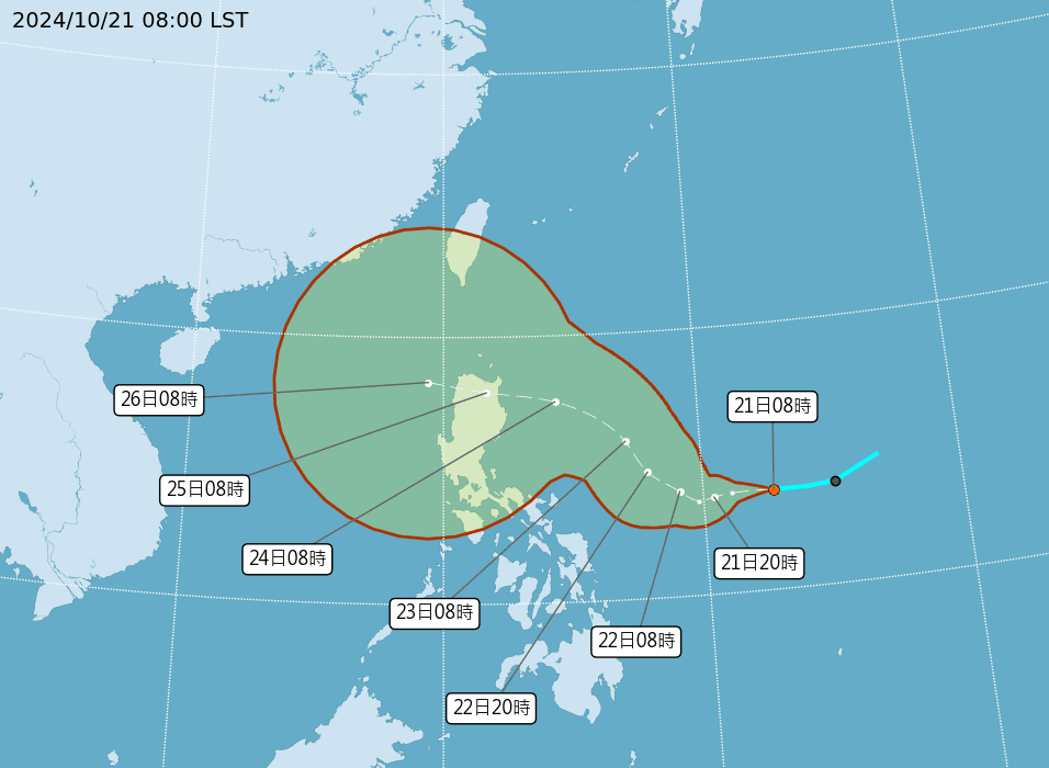 綜合當地媒體報導,熱帶性低氣壓TD24,目前位置在呂宋島東南部以東約1,050公里的菲律賓海面上空,進入菲律賓責任區(PAR),此處環境有利其發展,威力可能進一步增強。菲律賓氣象局預測,TD24將持續向西移動,並在22日下午轉西北西至西北方向移動,預計增強為颱風之後,於25日登陸呂宋島北部。不過菲律賓氣象局也說明,不排除有路徑變化的可能性。