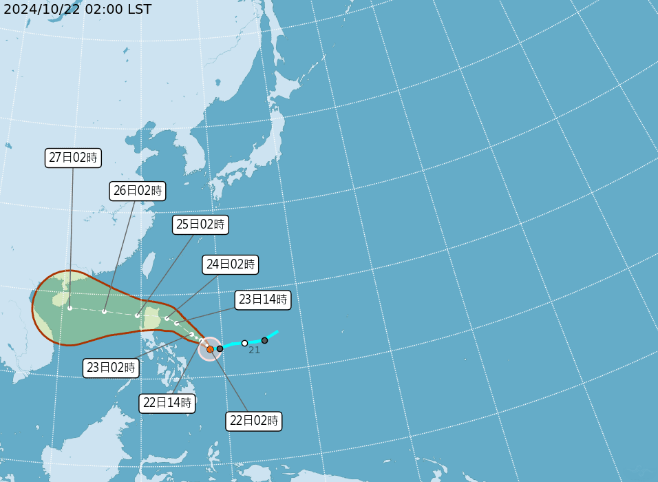 24日、25日颱風逐漸通過菲律賓呂宋島附近,受東北季風及颱風外圍環流影響,基隆北海岸、大台北、東半部地區易有陣雨,並有局部大雨或豪雨發生的機率,尤其宜蘭及花蓮山區不排除有豪雨等級以上降雨發生,中南部山區亦有零星短暫陣雨,其他地區為多雲。