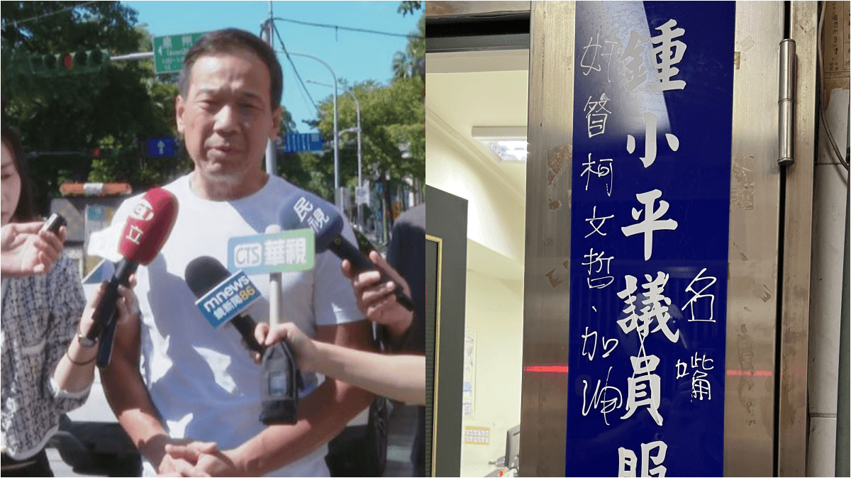 田山盛國昨(21日)上午前往鍾小平位於中正區南昌路的服務處,使用立可白在招牌上塗鴉,不僅將「議員」2字塗改成「名嘴」,還寫下「奸督柯文哲加油」。而警方獲報後,立刻調閱監視器畫面,迅速鎖定田山盛國,並通知其到案說明,訊後依毀損、妨害名譽等罪嫌移送北檢偵辦。