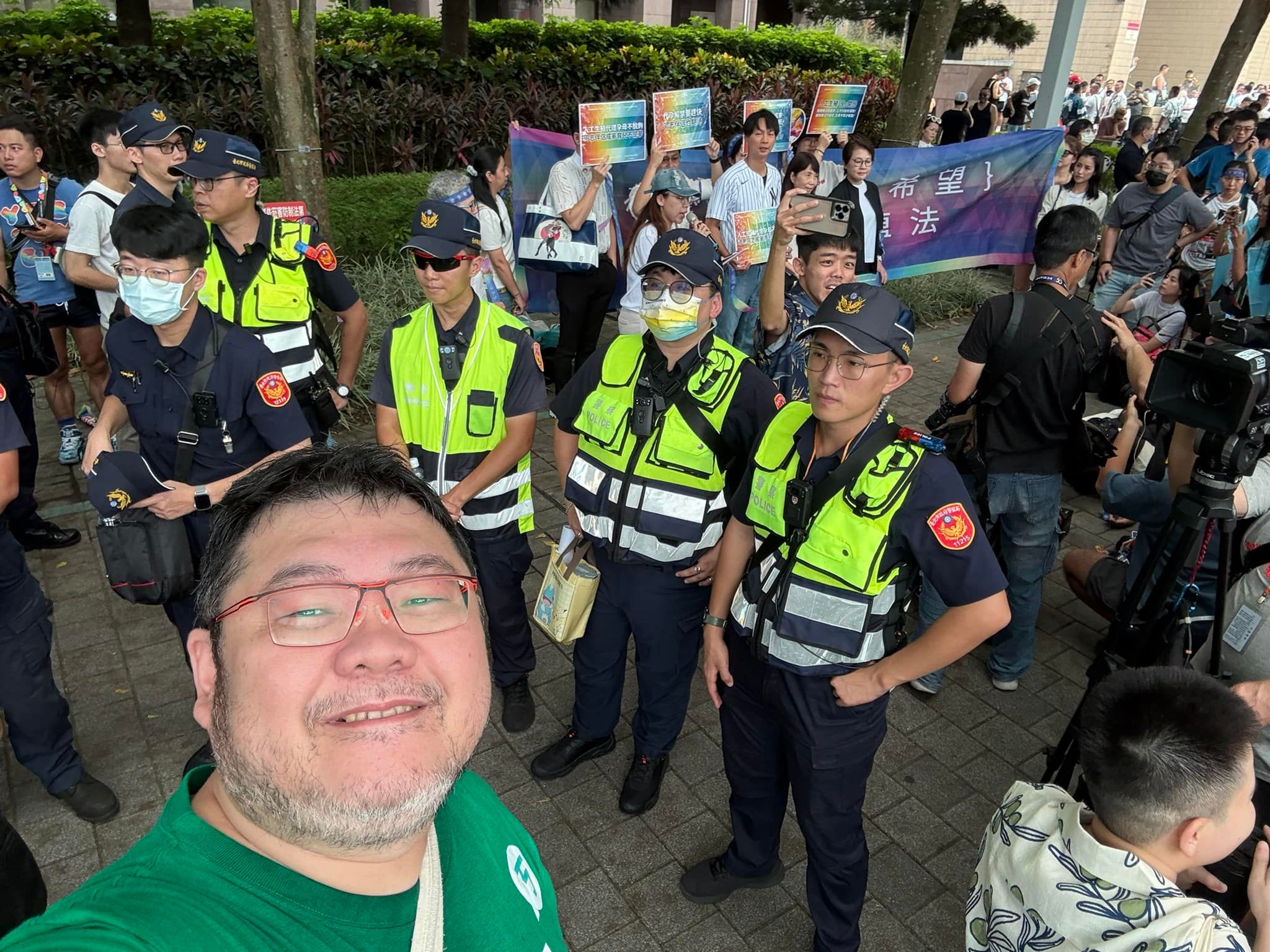 今(26日)下午民眾黨公職現身同志遊行,宣傳陳昭姿版本的《人工生殖法》,四叉貓也在旁觀察,稱警察在旁圍著保護安全,真是「笑死」。遊行開始後,四叉貓又發自拍照,稱一名警察拿著攝影機跟拍約半小時,「害得多毛壯熊都不敢靠近我」,還標記台北市長蔣萬安問:「是你下令的嗎?」