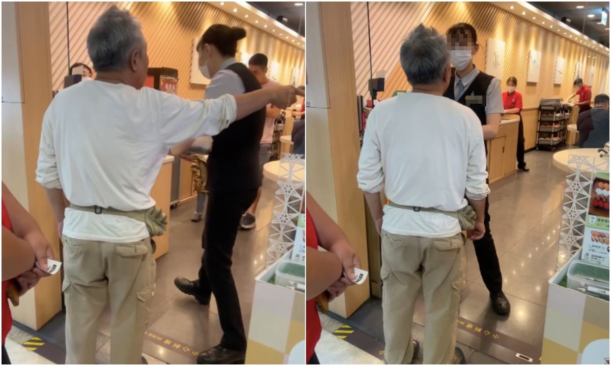 老翁指店員鼻子大罵的畫面被一旁目擊者拍下並放到各大社團,拍攝者並透露,到家樂福吃爭鮮,下一組叫號準備入座時,卻被老先生「倚老賣老說自己70多歲了,是老客人,為什麼不能先入座!」