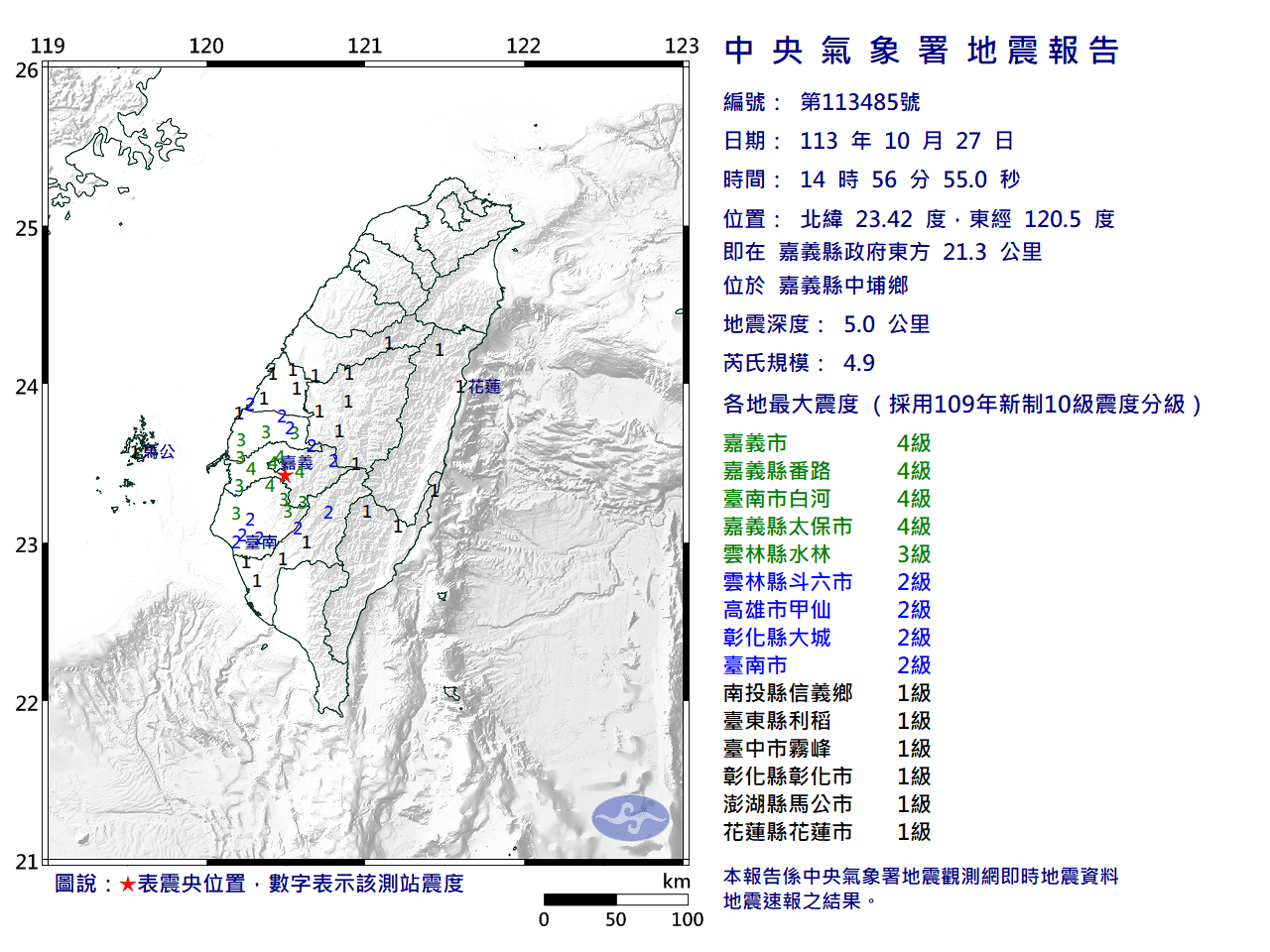 嘉義縣中埔鄉於今(27日)下午2時至今,發生8起地震,其中3起規模達到4以上,最大規模為4.9,共發2次國家級警報。氣象署地震中心說明,經搜尋此次震央附近過去30年歷史地震,可知規模4.5以上地震,相較東部不多也不頻繁,上次接近此次震央的地震為2018年,接下來一週發生規模4以上地震機率高,但目前仍無法做地震預測,呼籲民眾做好防震準備。