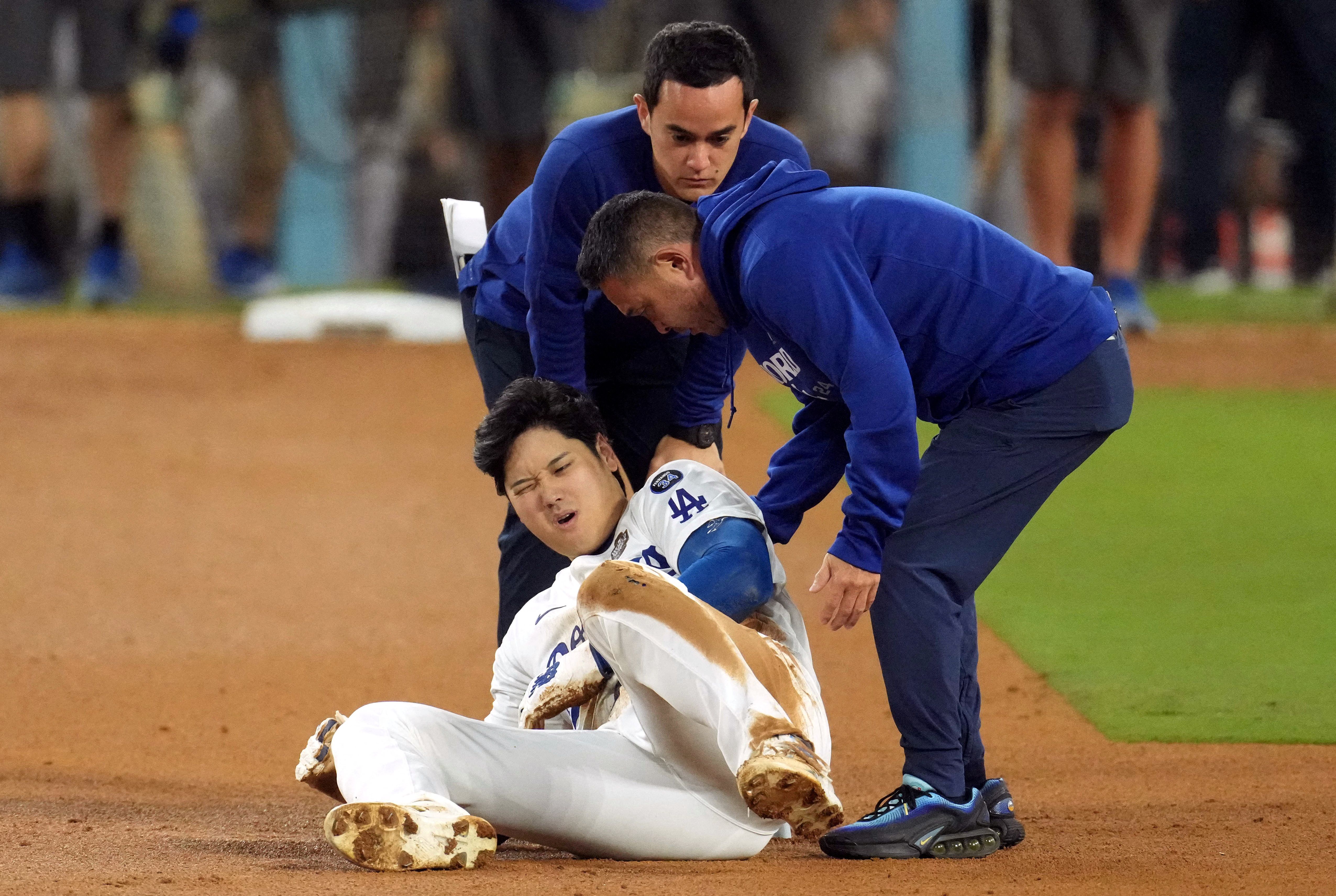 大谷翔平上一場比賽在第7局盜壘時,滑向二壘後動作不自然,隨後更倒在地上無法立即起身,大谷接著就下場接受治療與檢查,比賽後道奇總教練羅伯斯表示,大谷的左肩半脫臼,將進行精密儀器檢查,確認傷勢。