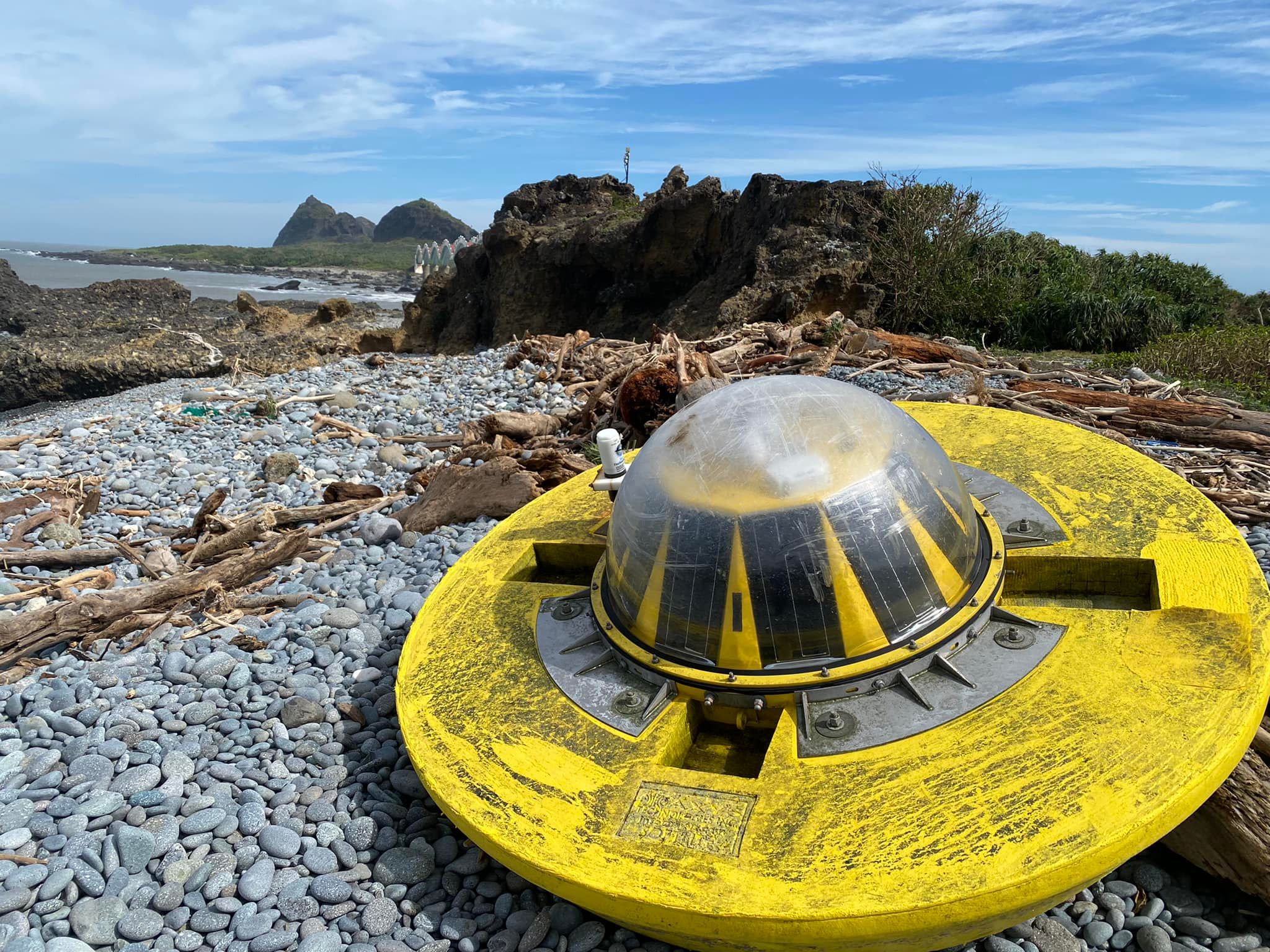 東管處今日在臉書粉絲專頁「【Nga'ayho】你好,東海岸 」發文,分享當地各處景點災情照,其中一張可見台東成功鎮基翬、靠近三仙台的海岸上滿是漂流木,一旁還有一個黃色大大圓圓的不明物體,有網友笑稱是「飛碟來撿木頭跟石頭」。