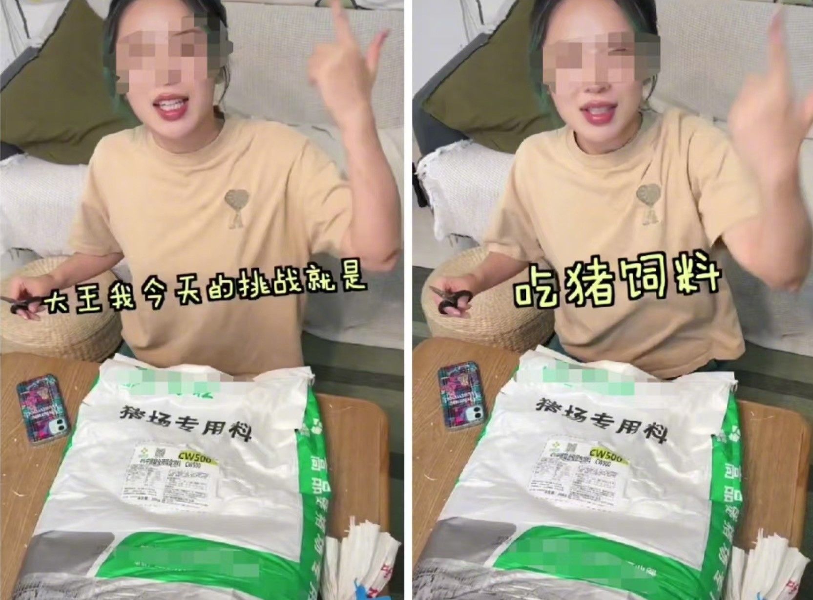 根據《上游新聞》報導,孔羽豐日前在社群PO出挑戰影片,要用「最少的錢過活」,她從網路上得知要在維持生命體徵的情況下,用最低的生活成本生活,可以每天吃僅3元人民幣(約新台幣13元)的豬飼料,於是她花100元人民幣(約新台幣449元)買了一包豬飼料,上方成分寫著大豆、花生、芝麻、玉米、小麥、麩皮,還標榜高碳水、高蛋白、低脂肪,全部純天然。
