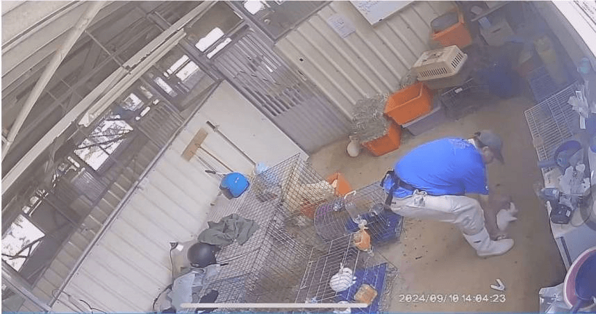 網友在臉書社團「兔寶認養●送養幸福樂園」公布監視器影片,只見獸醫抓住兔子耳朵,將兔子拽出籠子的同時,還踢開在門邊的另隻兔子,診斷時又用腳踩著兔子,動作粗魯,導致兔子有骨折、出血情形。爆料網友並稱,高層無作為、總經理包庇等。