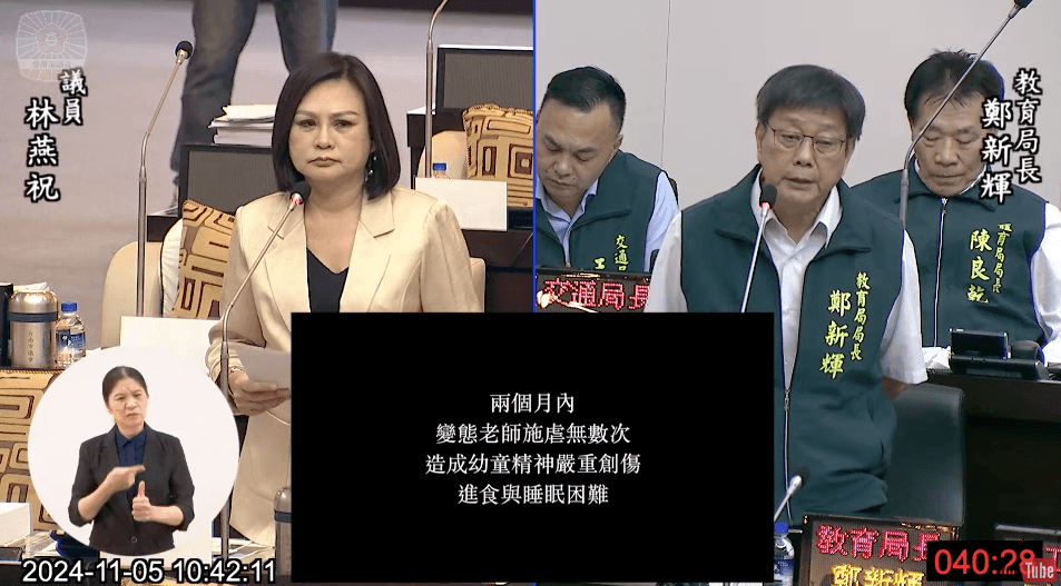 林燕祝接獲女童媽媽陳情,指出小孩今年才到安平區某私立幼兒園上課,起初都沒有異狀,直到8月間由王姓女教保員接手照顧後,小朋友身體接連出現傷勢,王女則稱是在家裡跌倒所致,後續更有多種理由唐塞,直到小朋友哭鬧著不想上學,經追問後才說出被老師不當對待的過程。
