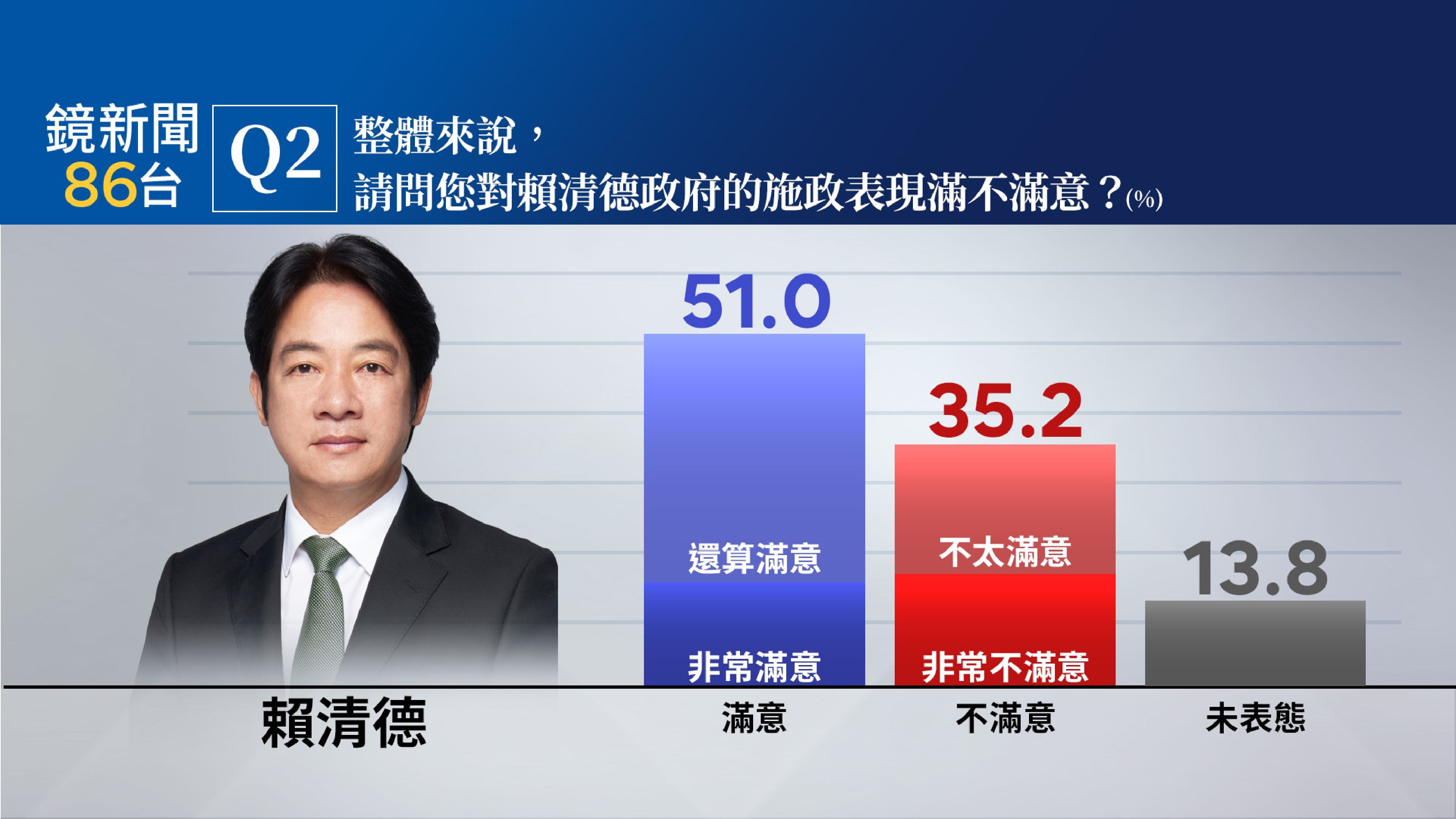 賴總統施政滿意度 51.0%滿意、35.2%不滿意