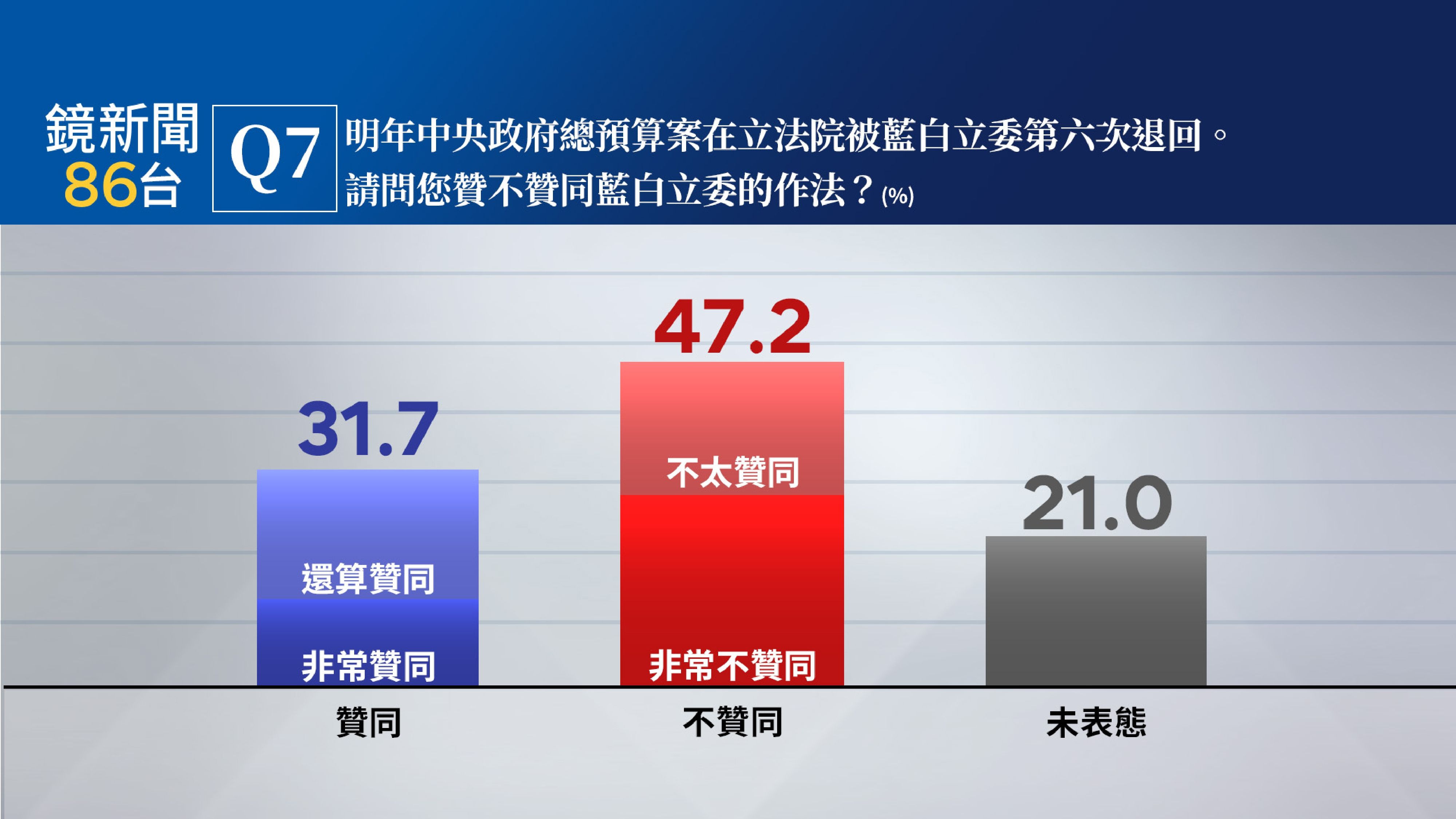 國會藍白六次退中央政府總預算 近五成47.2%不贊同、31.7%贊同