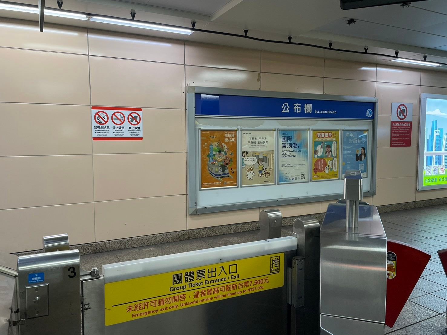 北捷指出,捷運系統內「禁止吸菸」、「禁止飲食」標示,自通車至今實施已28年,為因應近年來社會急速變遷,即日起增設「禁帶危險物品」標示。初步於大安站(文湖線)、南港展覽館站(文湖線)、古亭站、台北101/世貿站、台北車站(板南線)、淡水站、南京復興站(松山新店線)、西門站、市政府站、頂溪站、蘆洲站等11個車站張貼,此外,5條捷運路線也各選擇一部列車張貼。