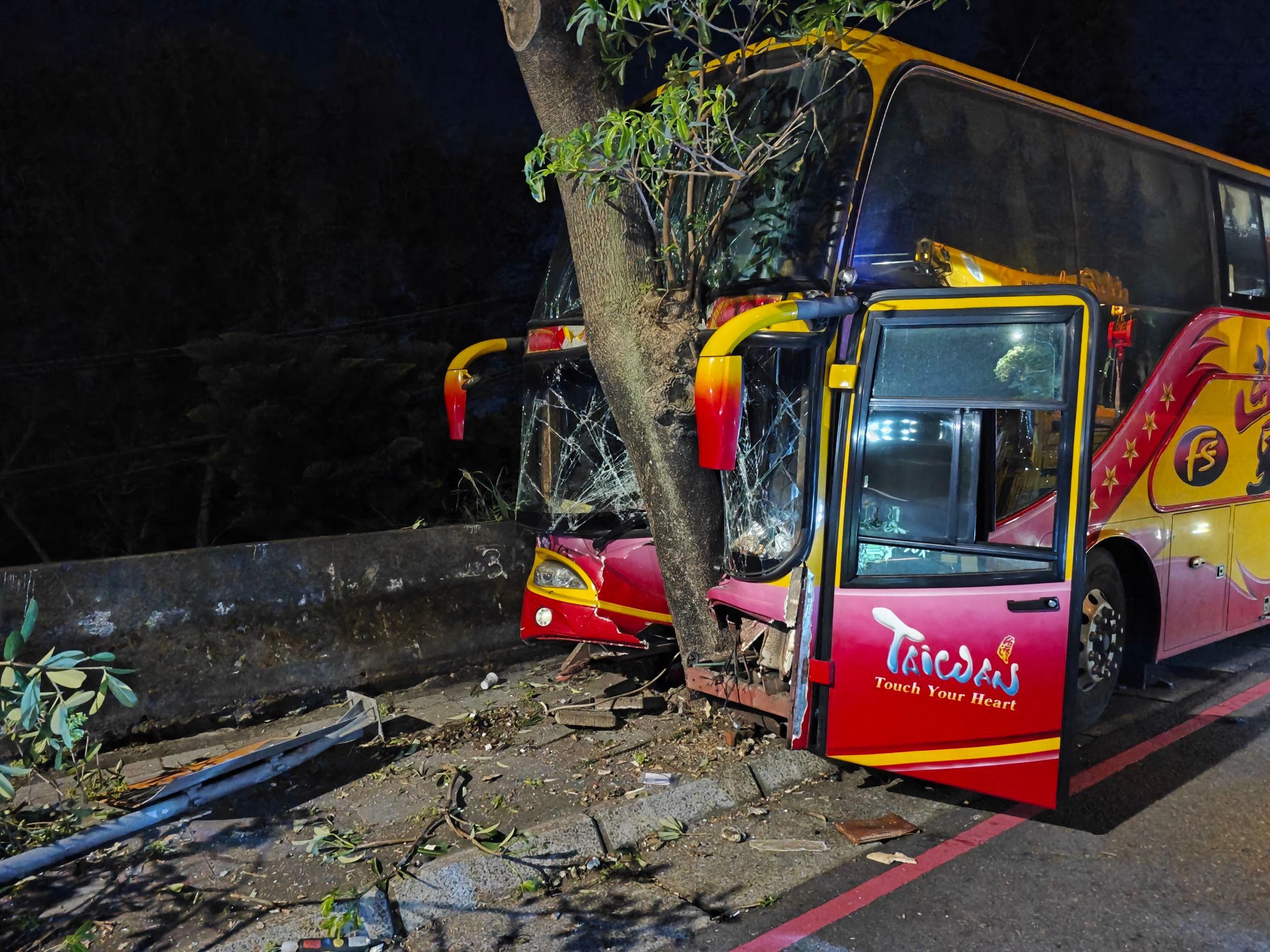 54歲謝姓男子駕駛育達高中校車,於17時45分許往楊梅方向行駛,因不明原因自撞人行道路樹,熱心民眾見狀報案,消防隊趕赴現場,啟動大量傷患檢傷機制後送醫院,共計出動消防人員18名、消防車5輛、救護車5輛。