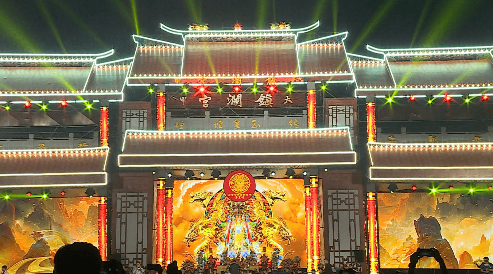 台中大甲體育場15號晚上哨角鑼聲密布這裡聚集了包括大甲鎮瀾宮董事長顏清標在內眾多海內外媽祖宮廟執事以及信徒,其中規模最大的總壇玉皇壇啟燈儀式,在大家人手一盞雷射燈共同射向壇中央彩球後,一時之間絢麗煙火從四面八方轟然升起,氣勢磅礡。