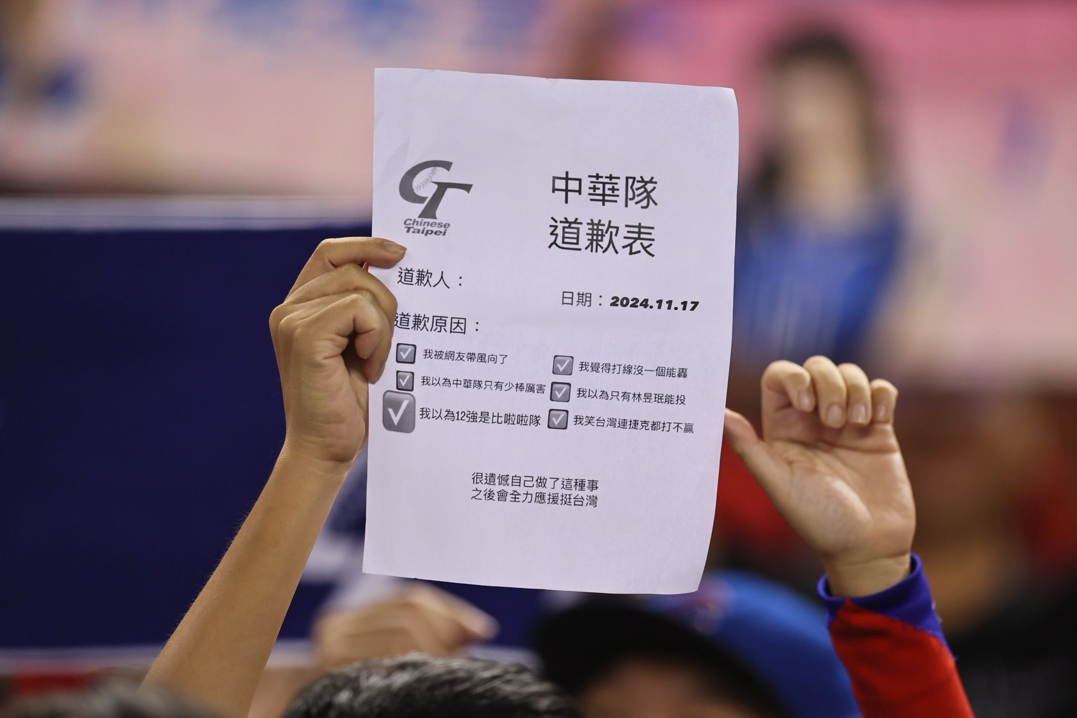 先前12強台灣隊28人名單公布後,戰力被許多球迷不看好,台灣隊則用實力破除負面聲浪。台灣隊首戰以6:3擊敗韓國後,網路就掀起道歉潮,球迷製作多種版本「道歉表」,向總教練曾豪駒、台灣隊以及球員致歉。