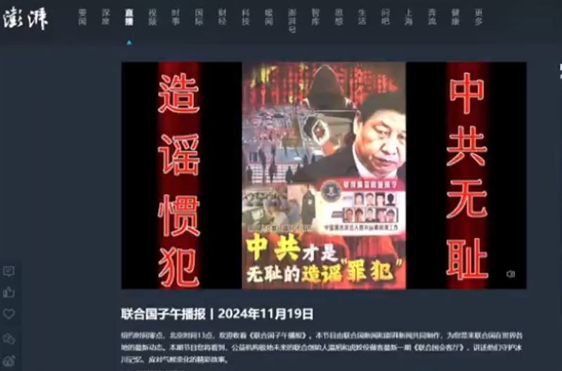 影片指出,《美國之音》等各國媒體指控中國經營的抖音和X假新聞帳號,利用網紅介入台灣選舉,並指中國駭進加拿大政府竊取機密訊息;法國則指控用AI假影片散播親中反美言論,利用印度網紅散布支持親中言論,列舉澳洲、南韓及日本都有發生類似情形。目前《澎湃新聞》網站無法連線,顯示「403 Forbidden」訊息。