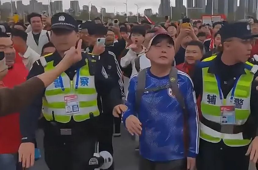 世界盃足球亞洲區第3輪資格賽C組,19日在中國廈門上演「中日大戰」,中國在主場1:3再次吞敗,中國球迷似乎難以接受輸球的失落,場邊發生騷動,一名疑似日本球迷被誤認是中國人穿日本隊球衣,被現場上千名中國球迷推擠圍剿是「漢奸」,中國警方雖然有上前保護該名男子,但之後這名男子被帶到角落,警方疑似要求他脫下球衣,以緩和現場氣氛。