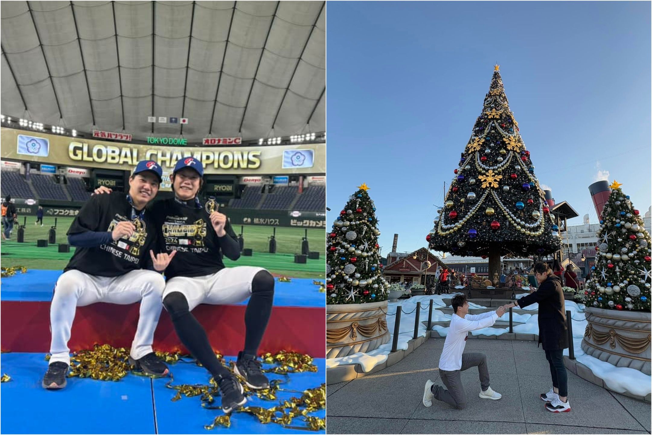 對此,郭俊麟今日也在社群發文表示,「昨日看直播,總統說沒結婚的選手可以結了,所以今日立馬求婚,陳陳他說好欸」,照片中可見他在迪士尼的巨大聖誕樹前單膝下跪,向站著的陳冠宇求婚,並戴上戒指,2人最後還露出害羞表情。