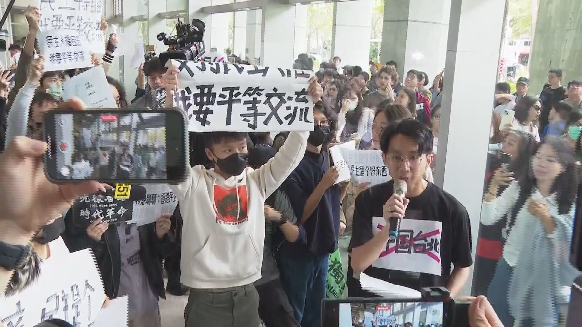 今(3日)來自中國的學生訪團參訪台灣大學,遇到多名台大學生手舉標語「我要平等交流」、「親,民主是個好東西」抗議,台大學生們更高喊「平反六四天安門事件」、「支持中國言論自由」等口號,馬英九基金會執行長蕭旭岑對此表示,自己不知道學生訴求是什麼,但台灣是多元自由的地方,可以表達自己的意見。