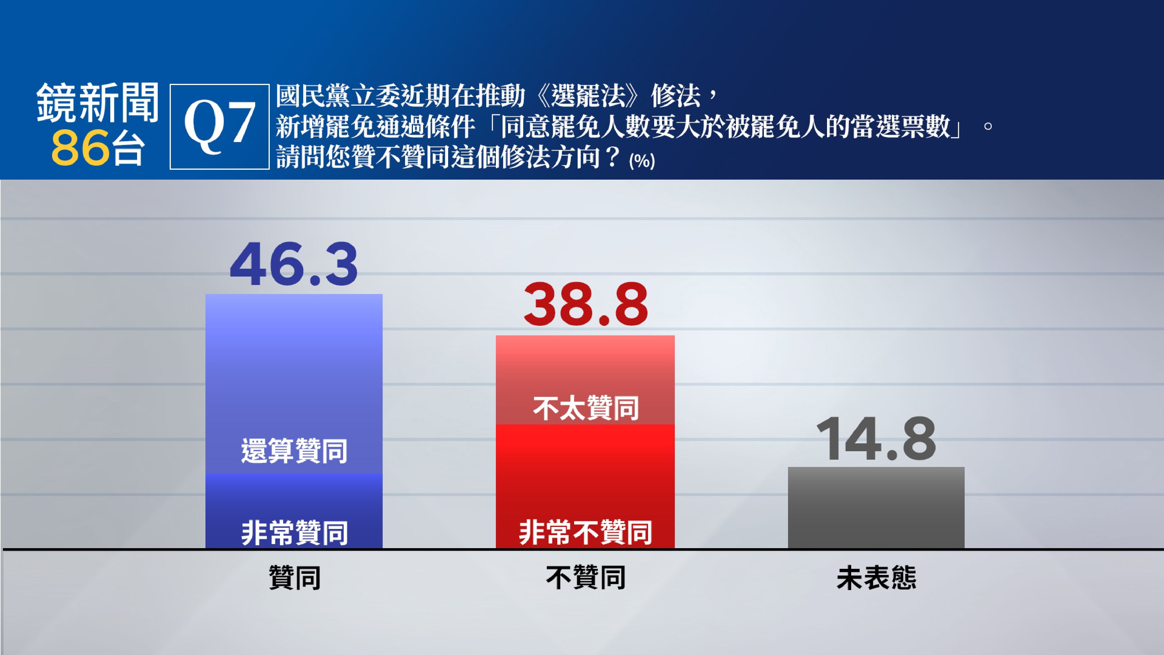 國民黨立委近期於國會推動選罷法修法,擬新增罷免通過條件「同意罷免人數要大於被罷免人的當選票數」,有46.3%民眾表示贊同這個修法方向(13.6%非常贊同、32.7%還算贊同),38.8%民眾表示不贊同這個修法方向(不太贊同16.3%、非常不贊同22.5%)。14.8%未表態。