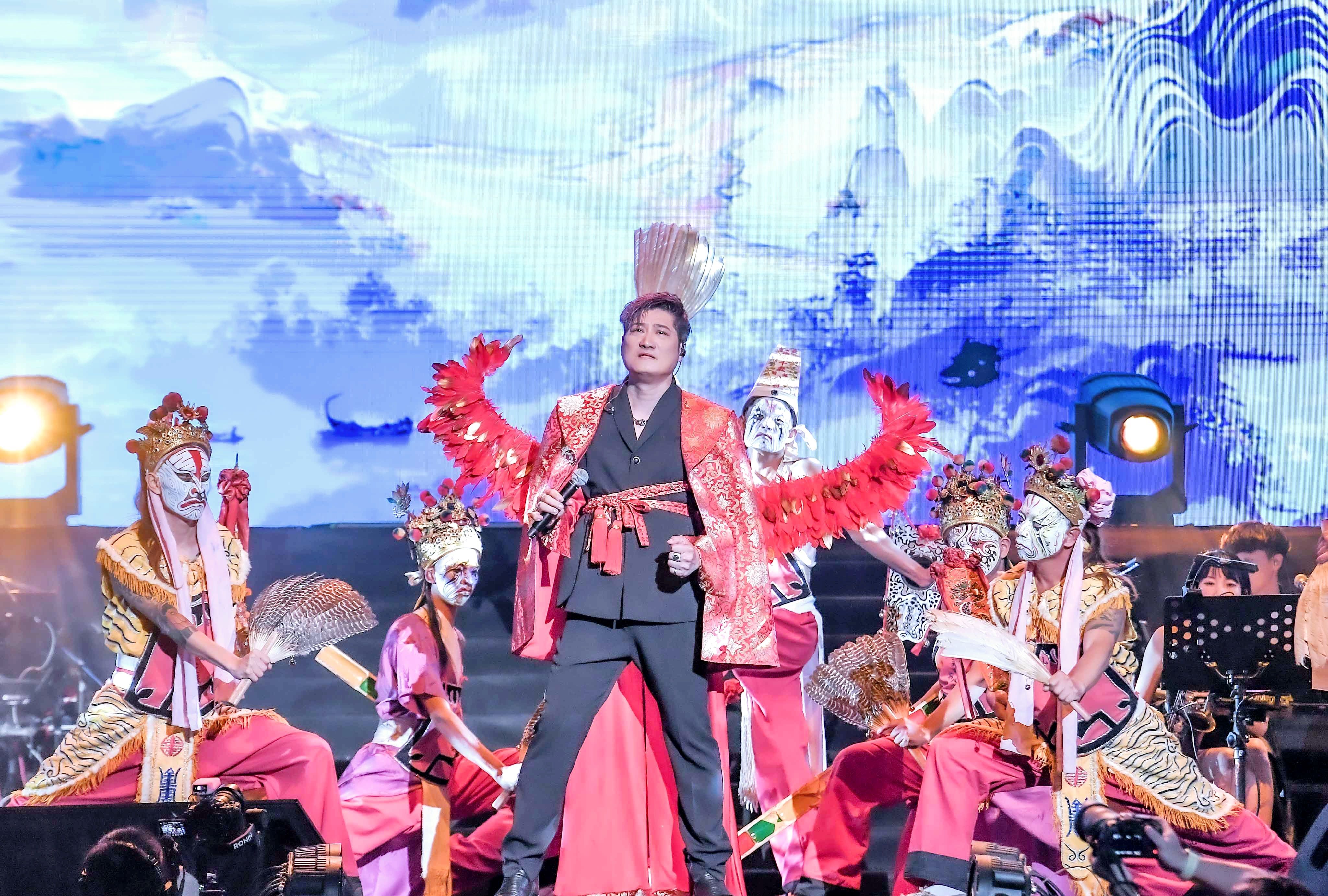 楊哲(左)帶著小孩、老婆一起演出。(豪記唱片提供)楊哲與愛妻雅瑩曬恩愛對唱〈你若不識我〉,感謝多年來風雨走來,老婆不離不棄,也與寶貝兒子們可愛對唱〈父子情深〉,現場滿滿的溫馨,而楊哲一雙紅羽毛翅膀浴火鳳凰造型與八家將氣勢登場演唱〈時也命也運也〉,震撼威力狂爆錶,接著轉換心情,感性演唱〈惜情〉、〈若是有一天〉等金曲,完整呈現不同演藝階段的星路成長,而主唱白沙屯媽祖進香主題曲〈粉紅超跑〉爆紅,情歌天后林姍華麗登場,楊哲再次重溫當年為二姐江蕙創作的名曲〈夢中的情話〉,兩人挑戰飆高音演唱,讓現場粉絲直呼太過癮了,掌聲響翻天,兩人再加碼對唱新歌〈今世情來世還〉,歌聲完美互動,感動著台下每一顆心靈!