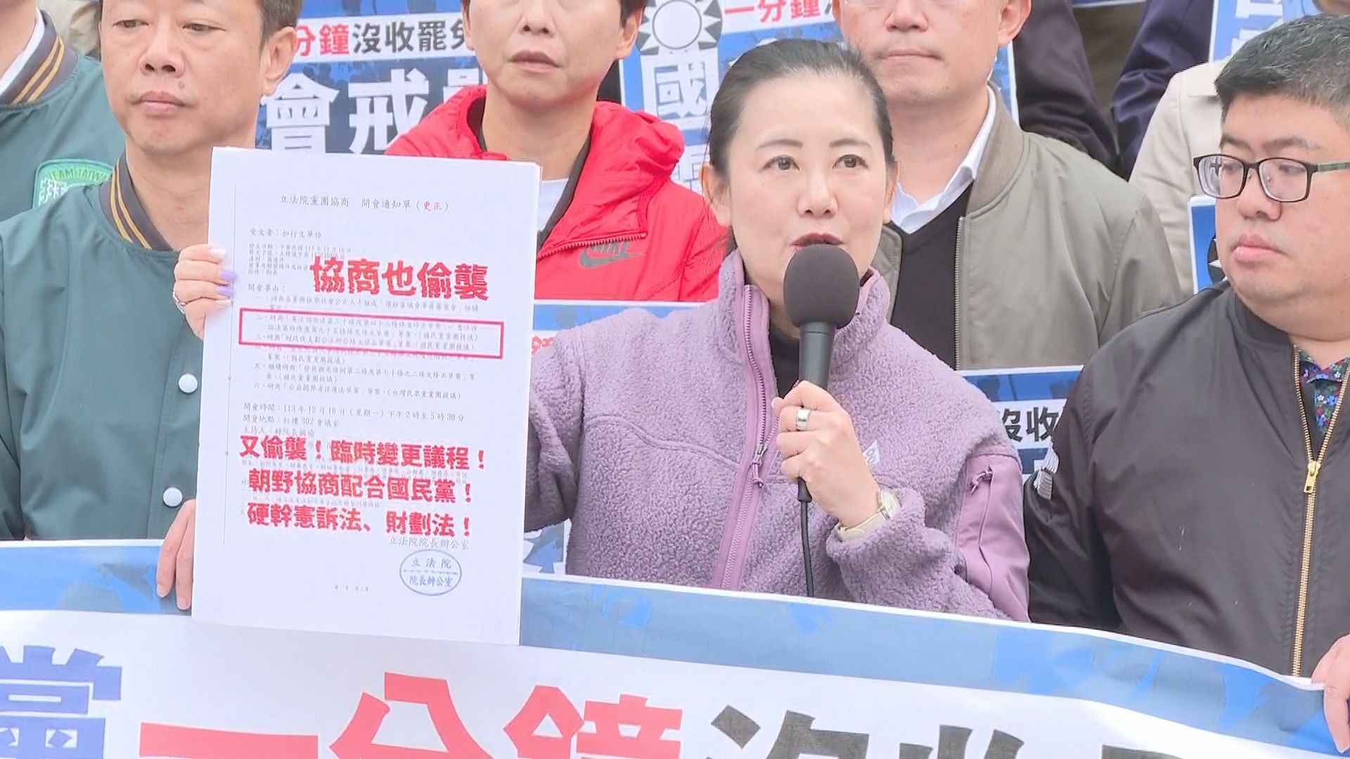 立院3黨,僅藍綠從昨(15日)晚間就開始布陣《選罷法》攻防戰,國民黨用保鮮膜和膠布封門,更將後門反鎖,以人牆死守前門,甚至部分藍委也不得其門而入,只能翻出窗戶,從外頭另找入口。民進黨立委清晨6時甲動到場,發現會議室走廊已被國民黨立委占滿,雙方爆發口角和推擠衝突。