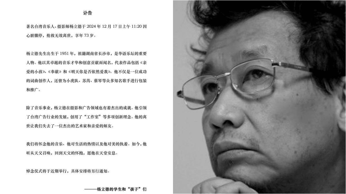 楊立德生前曾與蘇芮、小虎隊等多位藝人合作,代表作包括童安格〈明天你是否依然愛我〉、蘇芮〈親愛的小孩〉、黃韻玲〈藍色啤酒海〉等。除了音樂,楊立德在攝影和廣告領域也有所成就。好友趙麗華昨(17日)轉發訃告表示,失去一位傑出藝術家與親愛的師友,願他在天堂安息。