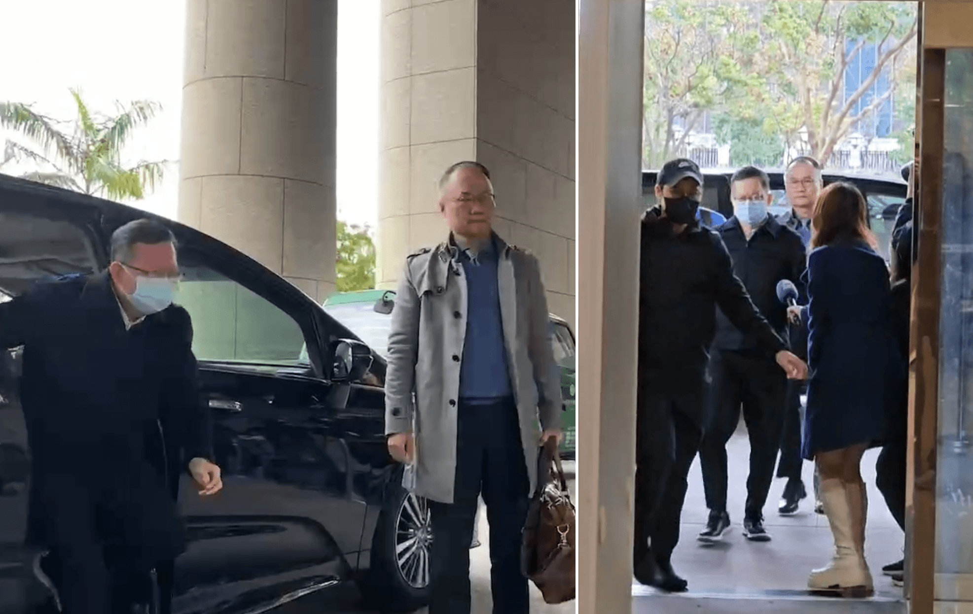 鄭文燦(左圖左、右圖左二)在律師陪同下進入地院,全程不發一語。