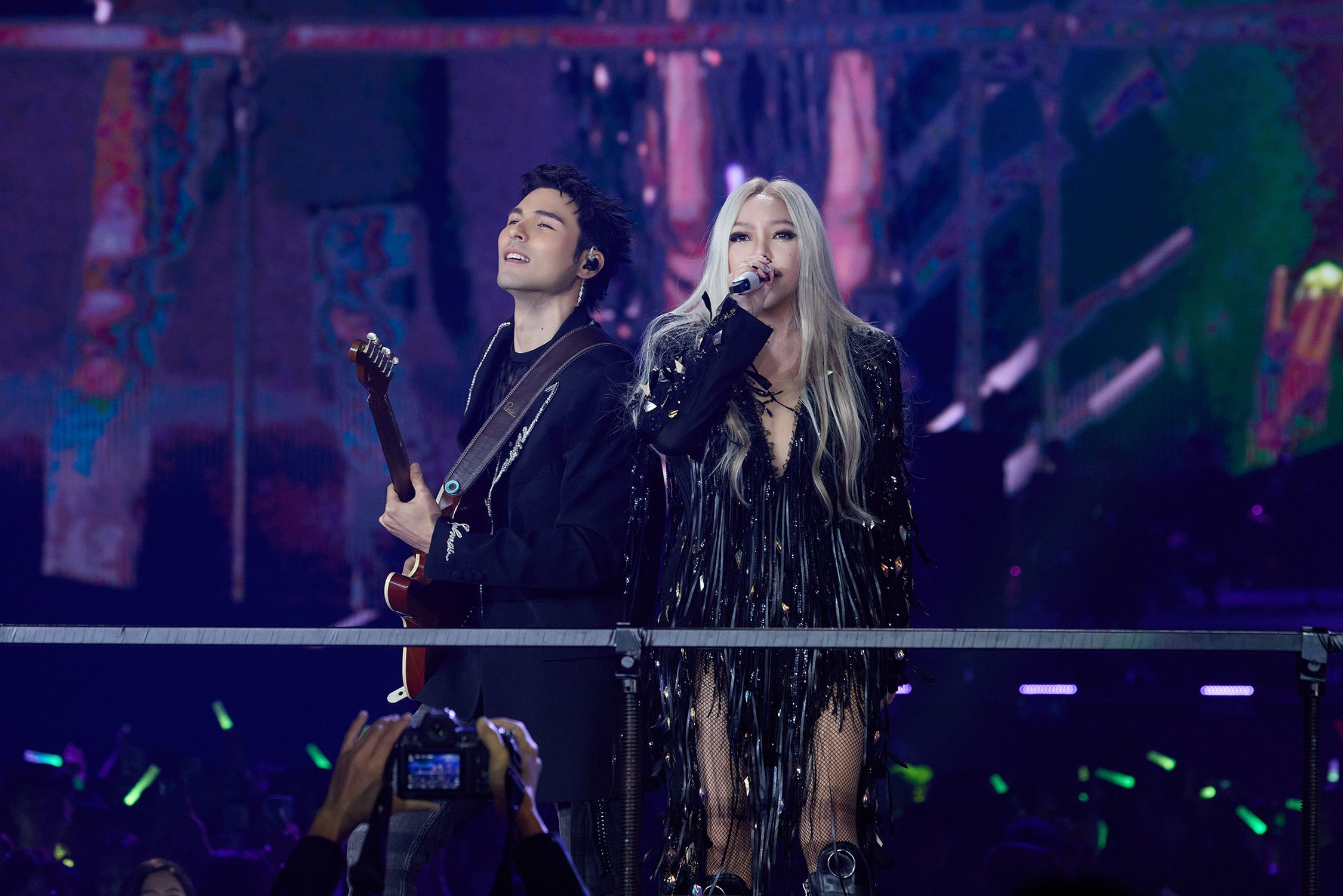 演歌雙棲的鳳小岳,除了演紅電影《艋舺》、影集《華燈初上》等代表作,2023年發行首張專輯《柒》,還一舉入圍今年的金曲新人獎。才華洋溢的他這次毛遂自薦,透過張惠妹之前的助理轉達想來幫阿妹彈吉他,沒想到天后聽完覺得很有趣,就邀請鳳小岳來「快閃」演奏,在演唱〈永遠的快樂〉時,鳳小岳以吉他手身份登台,大飆吉他放電,張惠妹也嗨得秀出M字腿,讓全場粉絲嗨炸。