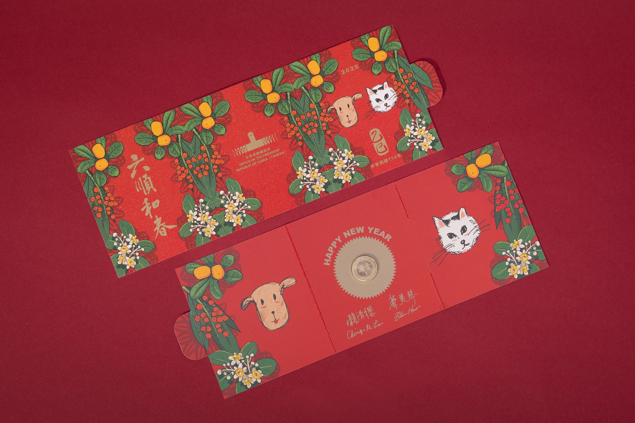 總統府今(30日)公開2025春節賀年禮包,其中春聯的題詞是「六順和春」,象徵六六大順的賀春之意;特別的是,這次賀年卡是由總統賴清德和副總統蕭美琴,分別親自手繪的愛犬斑斑、和愛貓Fluffy為主角,再由設計師加入象牙柿、月桃和瓊崖海棠等3種台灣原生植物繪製而成,充滿童趣與年節的歡樂氣氛,這組賀年禮包,預計將在元旦升旗典禮後開始發放。