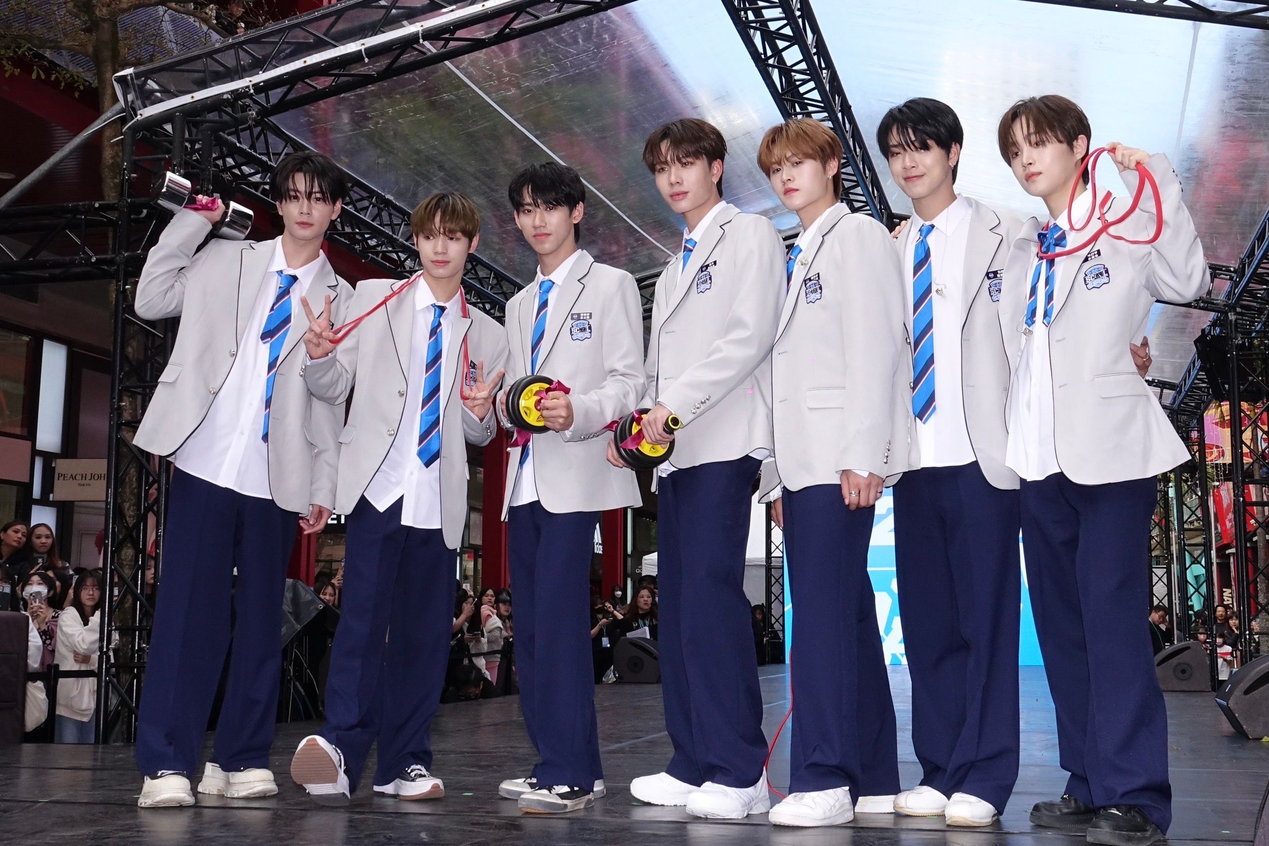 U:NUS成員蔡承祐(左四)特別來站台,還送上健身三寶,叮嚀偶像後輩把肌肉練起來。(陳德興攝)由台韓選秀節目《SCOOL》脫穎而出的SEVENTOEIGHT,在新年之際舉辦簽唱會,還揪其他25位人氣選手輪番上陣開唱,全場共32位台韓鮮肉齊聚一堂,直接開啟「返校新年派對」與粉絲同歡,誓言「從白天簽到黑夜」!準備要以「車輪戰」的分組方式登場簽名,由於要確保每位粉絲都能簽到名,每人都已經有心理準備「簽到晚上12點」,其中美祥還透露每位成員為了要把時間留給粉絲們,打算都「少喝水」、「憋尿」,以免耽誤太多時間。