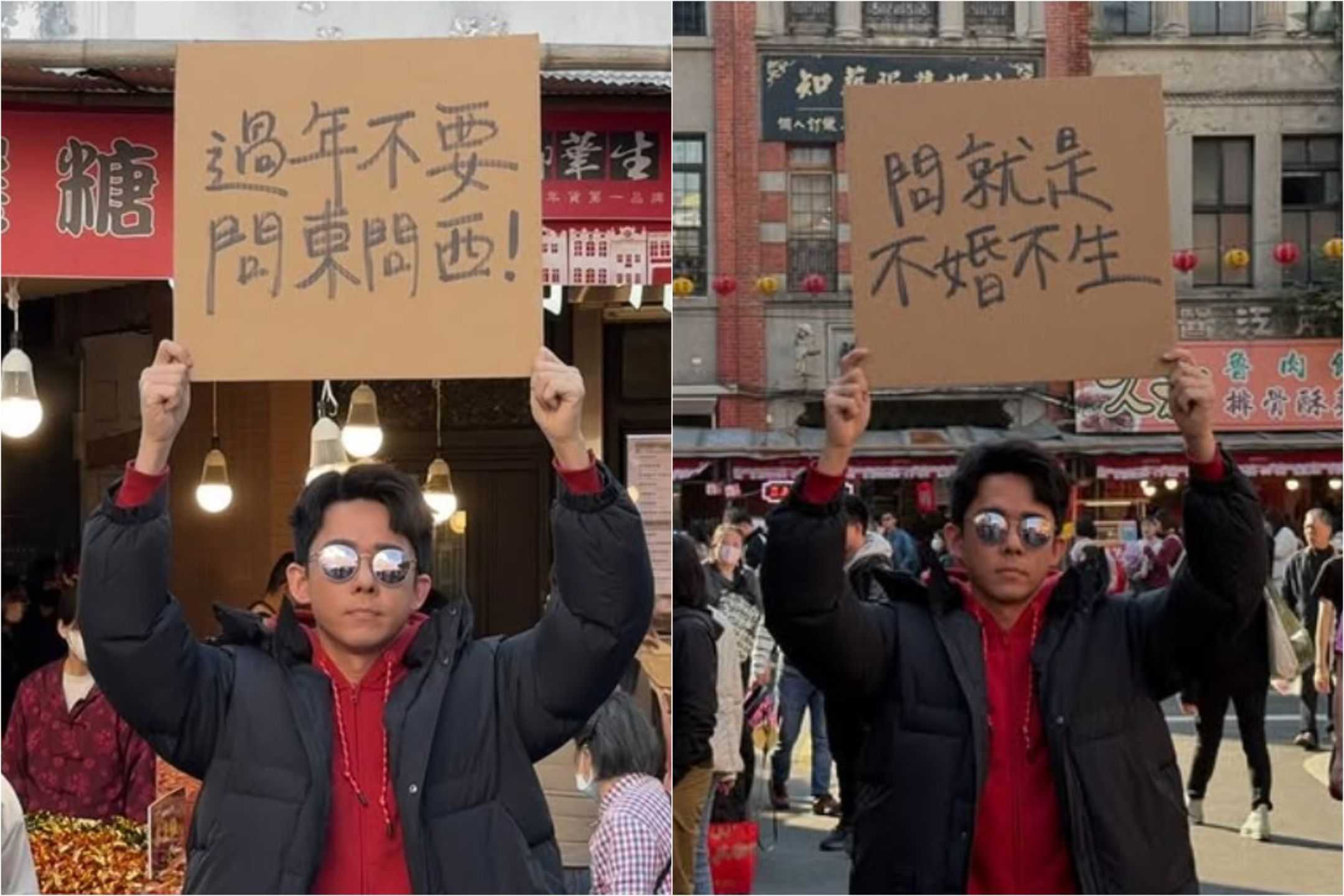 農曆春節長達9天,YouTuber阿滴日前到台北年貨大街舉牌,上方的文字應景寫著「過年不要問東問西」、「問就是不婚不生」等文字,這些是許多人每次過年都可能會被長輩或親戚問的問題,因此引起網友共鳴,大讚:「好實用喔。」