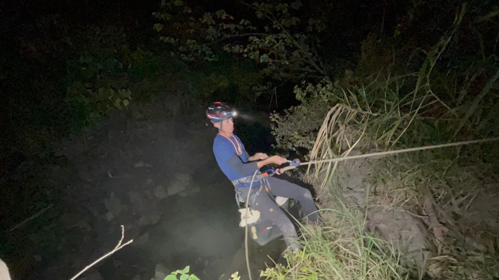 所幸有其他遊客得知後,致電給正在台南山上水道博物館舉辦攀岩活動的友人請求協助,該名教練隨即帶著裝備前往了解狀況,並以繩索垂降方式降至谷底,找到柴犬後將牠放進袋子中固定,最終花費1個半小時將柴犬平安送回地面,與飼主團聚。