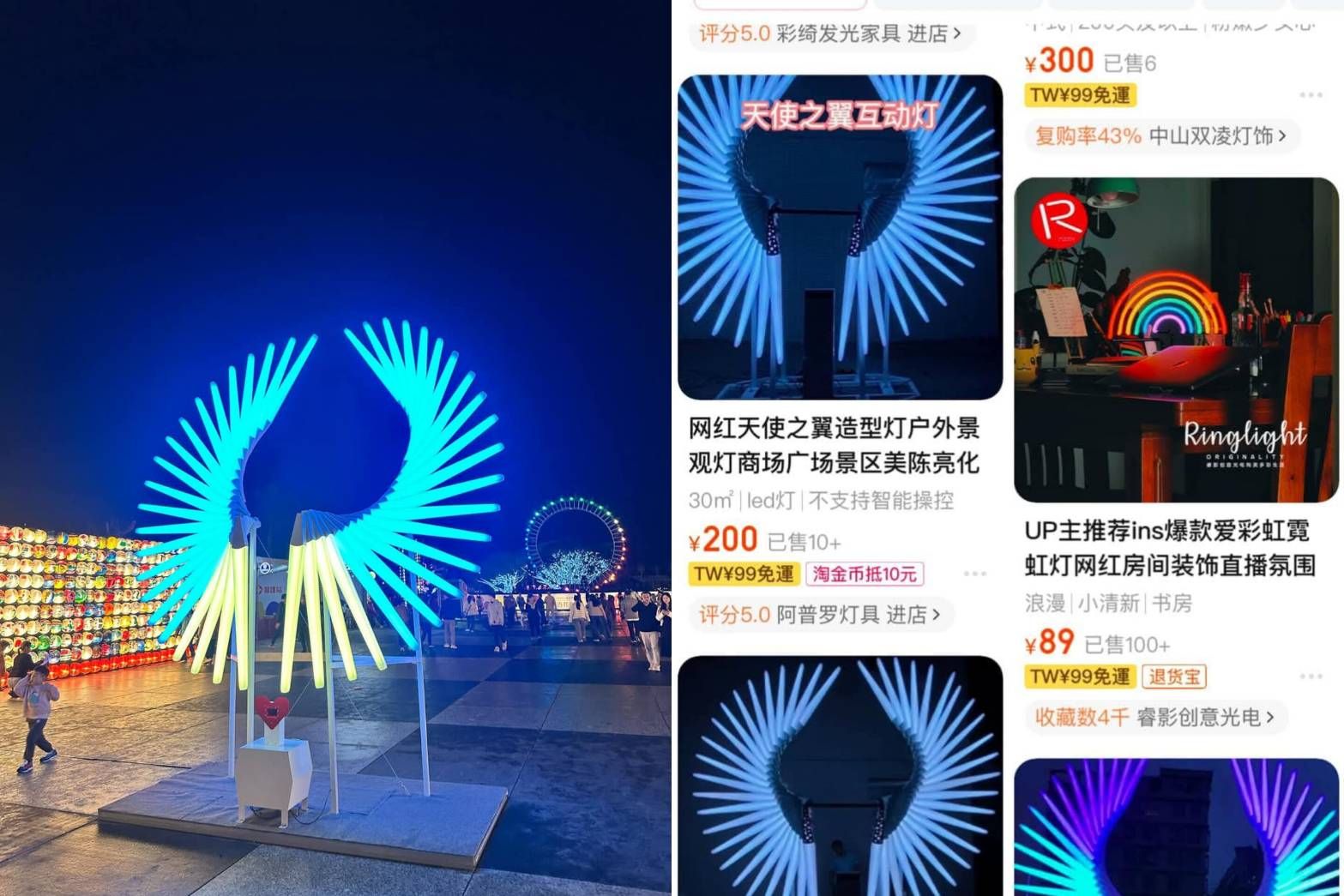 花蓮縣府斥資2,000多萬元舉辦燈會,卻有網友發現裝置藝術「天使之翼」疑似是中國淘寶貨,成本加運費、人工組裝測試費大概約20萬元一組,質疑「花蓮是沒有設計人才了嗎?」對此,花蓮縣府觀光處長余明勲今(15日)回應,對於裝置藝術是不是淘寶貨並不清楚,但燈會不只天使之翼,共有4個展區及不同主題活動,不應以單一燈飾概括,且今年燈會1個月已累積超過60萬人次到訪,成效非常好。