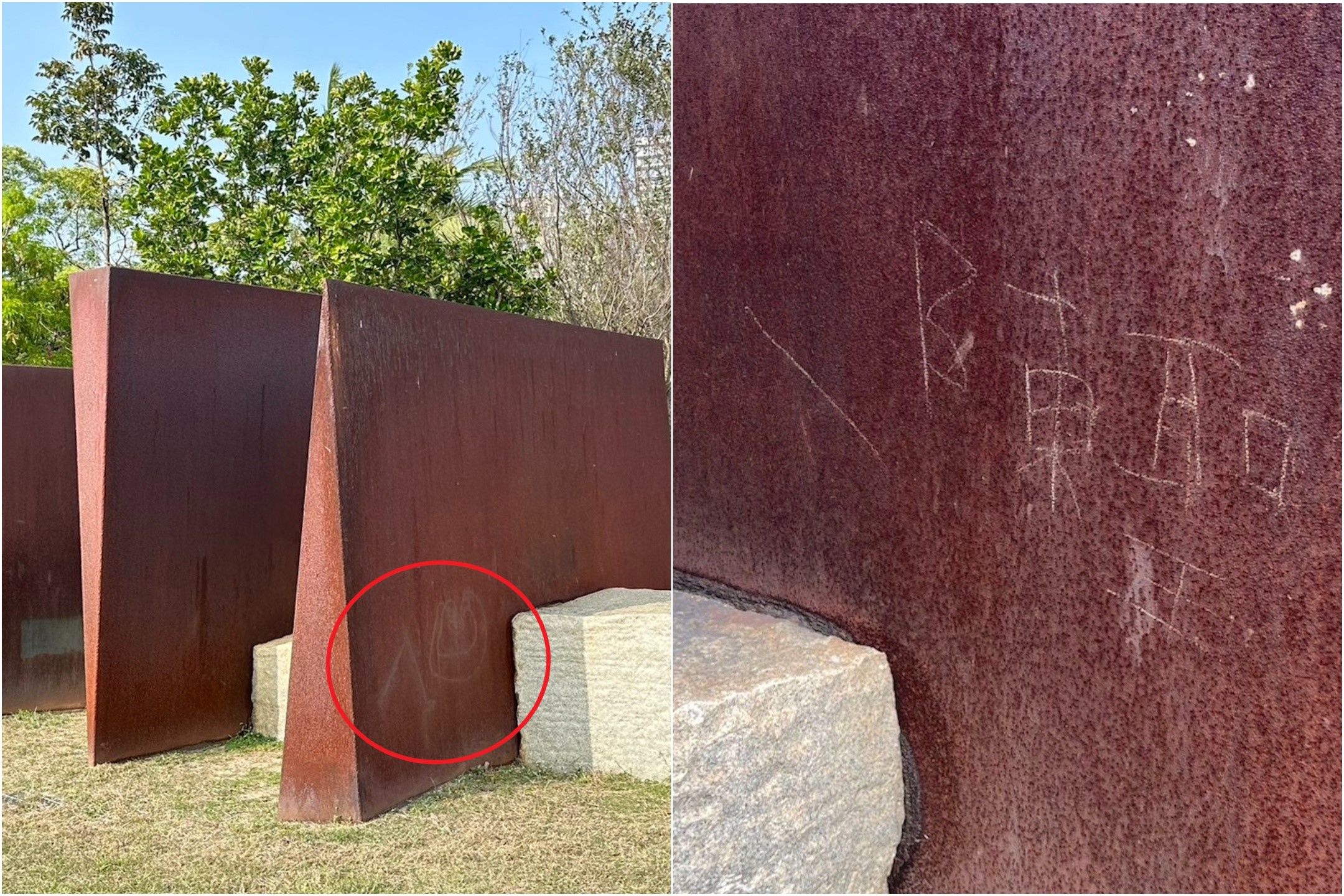 高雄市立美術館(以下簡稱:高美館)戶外展區的藝術家作品近日遭不明人士塗鴉破壞,甚至還疑似留下簽名,館方發現後立即請修復師到場,但仍無法完全去除痕跡,對此,警方表示尚未獲報,將派員主動查訪。