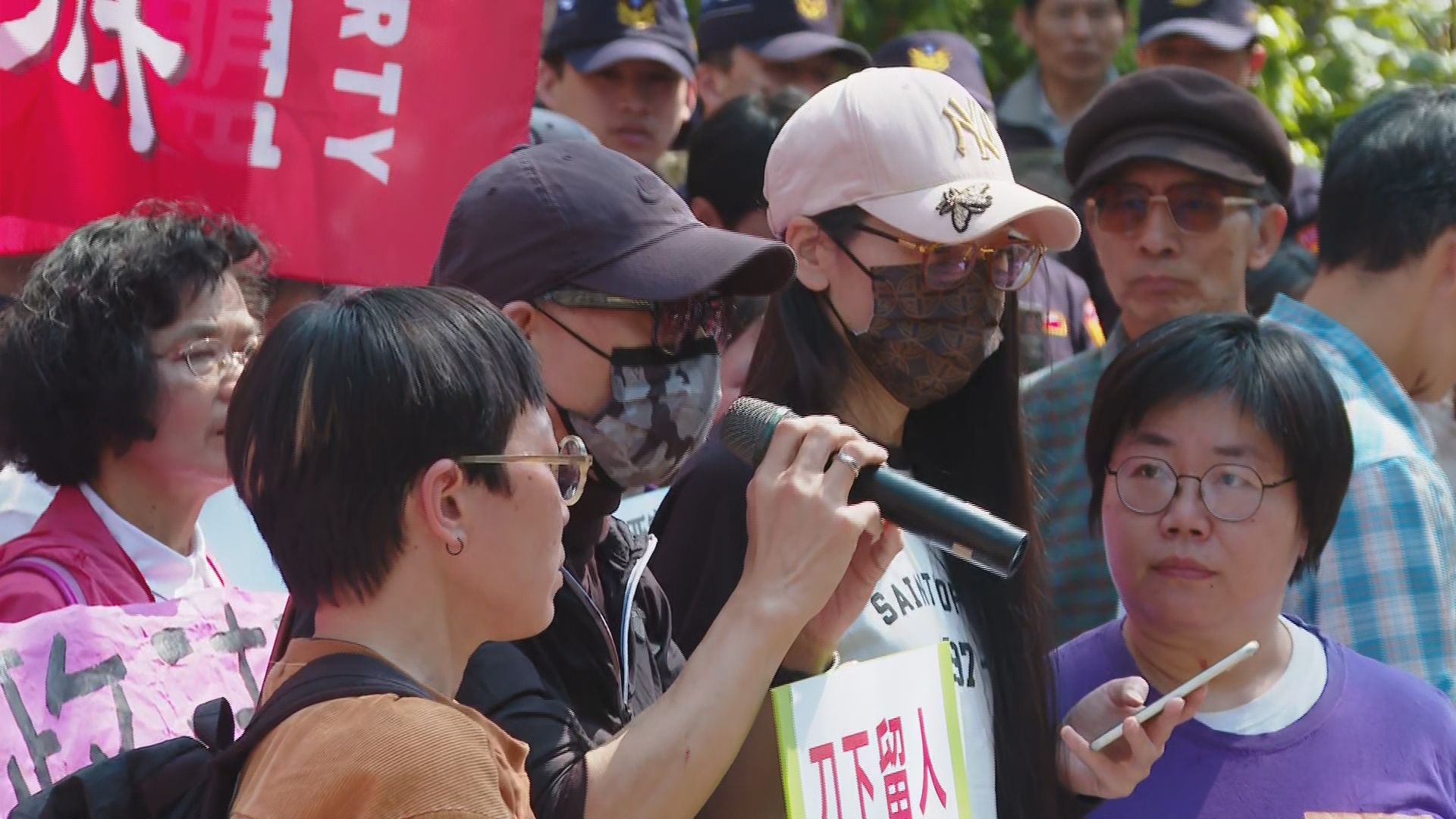 民團「台灣國際家庭互助協會」聲援亞亞,抗議移民署和高等行政法院違反國際公約,侵犯人權,亞亞原本說會帶小孩到內政部前一同抗議,不過今(25日)上午,只有亞亞老公現身,亞亞本人則是頭戴粉色鴨舌帽、墨鏡和口罩到場。