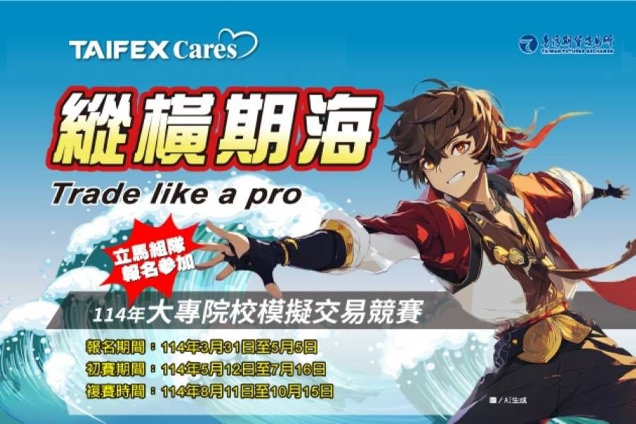 協助大專院校學生深化期貨知識及培養風險控管意識,期交所自110年起舉辦大專院校模擬交易競賽,去(113)年吸引近千名學生組隊報名參賽,反應熱烈、深獲好評;今(114)年期交所持續與財經媒體合作舉辦本項活動,並採初複賽兩階段賽制,於3月31日至5月5日受理報名,5月12日至7月16日展開初賽,8月11日至10月15日進行複賽。誠摯邀請大專院校師生踴躍報名參賽。