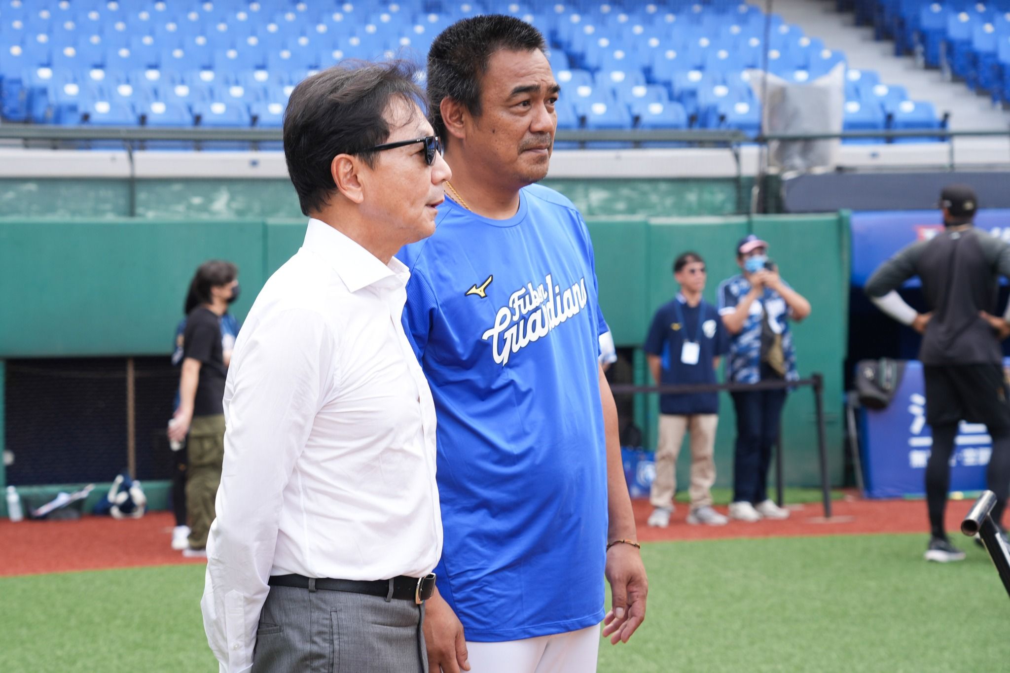 富邦悍將目前戰績以7勝21敗敬陪末座,主場也已經累積7連敗,富邦集團董事長蔡明忠今天特別到球場信心喊話,賽前練球時間全隊進行半小時閉門會議,開始練球開始後,他走到場上笑稱是第一次看練球,隨後又與總教練陳金鋒、副領隊林威助等人頻頻咬耳朵,罕見畫面引起圍觀。
