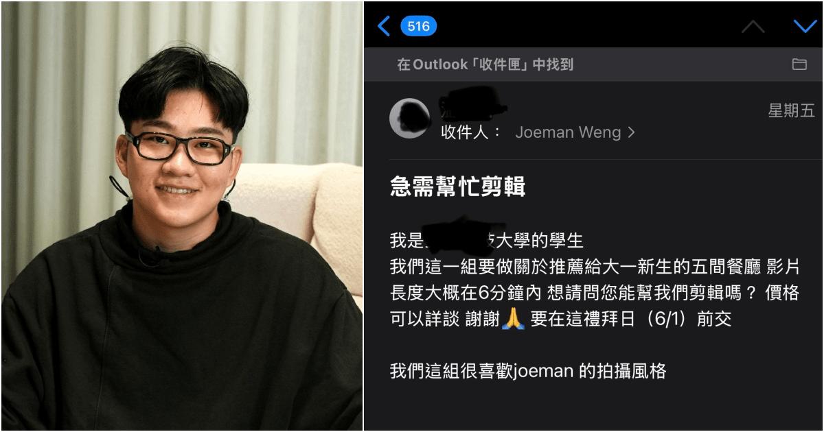 Joeman在臉書分享一封題為「急需幫忙剪輯」的信件截圖,內容提及是某大學的學生,組成的團隊要製作推薦給大一新生的5間餐廳影片,直接開出條件:「長度大概在6分鐘內,想請問您能幫我們剪輯嗎?價格可以詳談謝謝。」還標註要在6月1日前交件,結尾不忘提及很喜歡Joeman團隊的拍攝風格。