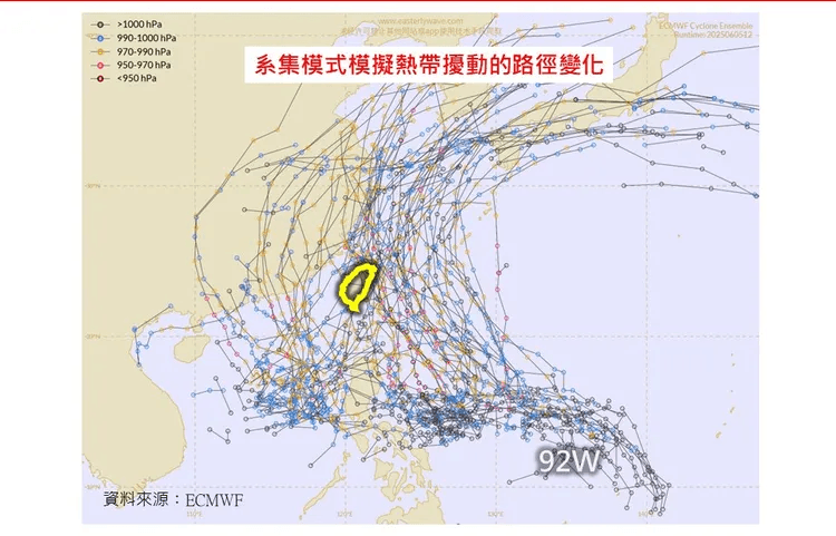 中央氣象署也提醒,本週末至下週,菲律賓東方海面至南海有熱帶擾動發展的機率。目前熱帶擾動「92W」位於菲律賓東部外海,海域海溫高達30至32℃,加上垂直風切小,屬於中度到高度有利的發展條件,成颱機率偏高,林得恩指出,若未來生成颱風,並在大氣環流導引下由南向北移動,其路徑恐將貼近台灣東部外海,甚至更接近陸地,屆時太平洋高壓的勢力消長,將成為颱風動向的關鍵因素。