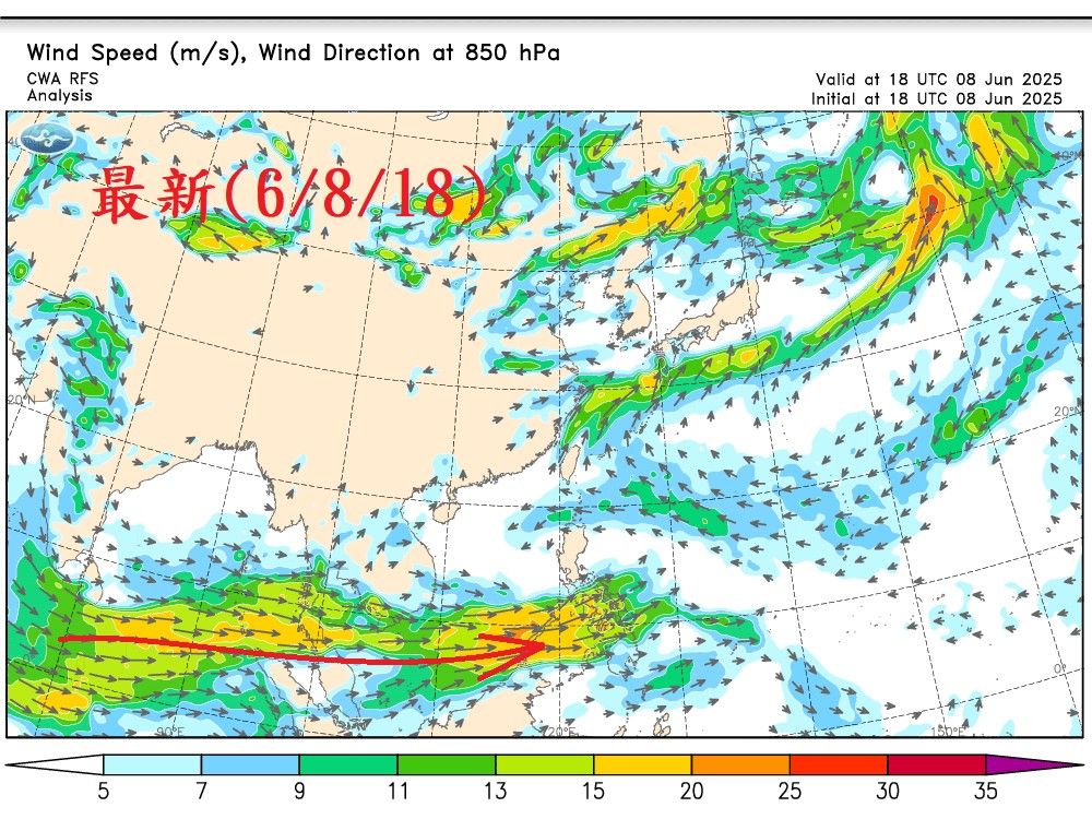 對此,鄭明典今(9日)在臉書發文指出,從850百帕風場分析圖來看,與前兩日相比,季風氣流明顯增強。他表示,季風氣流增強代表季風槽結構同步加深,在這樣的環境條件下,季風槽內容易激發更旺盛的對流,「季風槽有機會發展成季風低壓,或者在季風槽內發展出熱帶氣旋」。