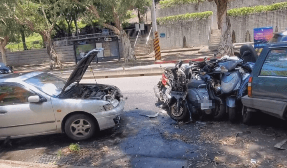 孫男今日上午11時許駕駛自小客車,搭載一名談姓女子,沿至善路二段由西向東行駛時,不明原因擦撞前方同向行駛的機車騎士蕭姓男子,隨即再衝撞停在路邊的4輛轎車、7輛機車,孫男、蕭男手腳受有擦挫傷,談女則似右手骨折,送醫治療後均無大礙。