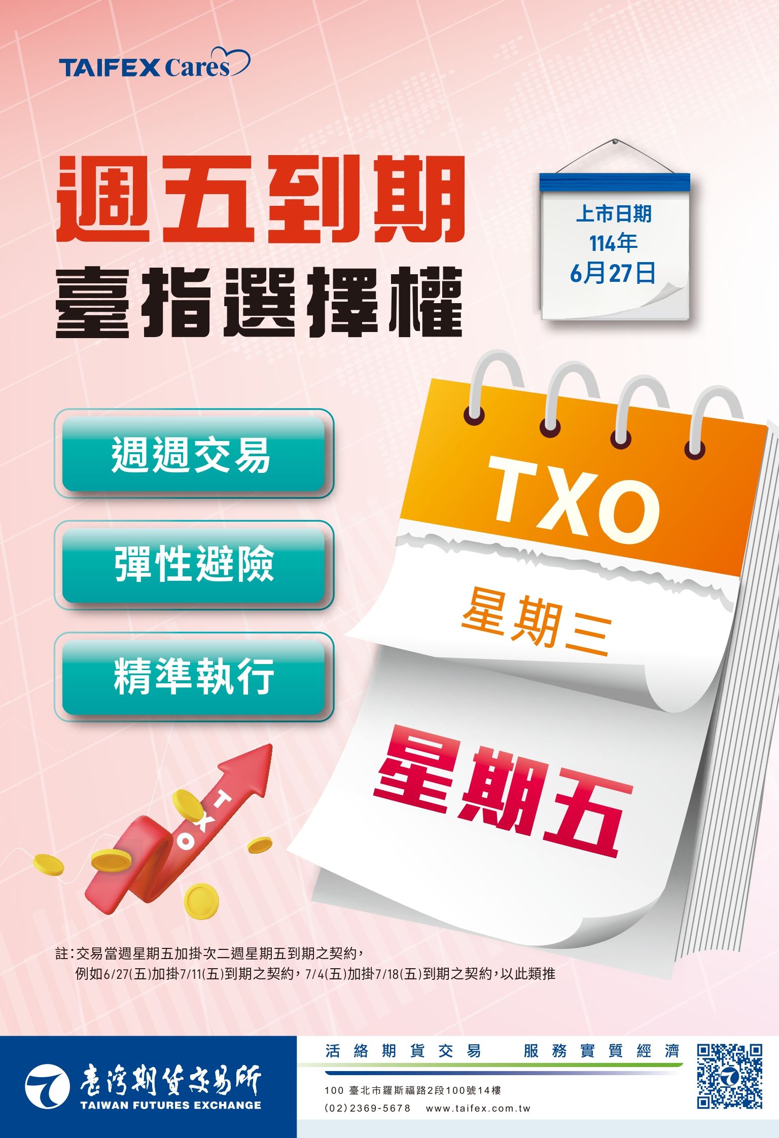 臺灣期貨交易所於6月27日推出「週五到期臺指選擇權」,除原有「週三到期」契約之外,進一步擴充至每週有兩個到期日,提供短期避險與策略調整之靈活性。新契約於每週五掛牌,交易人可交易當週與次週五到期之契約,形成週三與週五「雙到期」架構。有助交易人針對週四、週五發布的重大經濟數據或政策消息進行事件型策略操作,也強化避險展期與時間價差策略的彈性。例如交易人可於週三部位到期後,轉倉至週五契約延續部位,達到精準調整與風險管理目的。