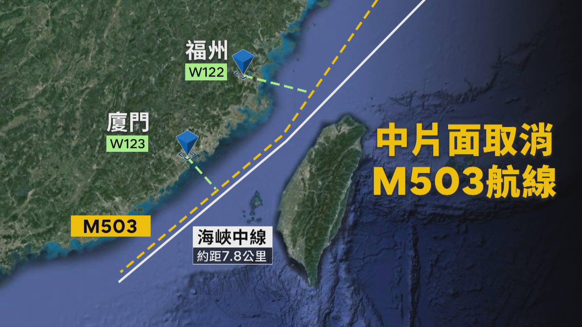 中國2015年在未和台灣協商下,單方規劃距離海峽中線僅7.8公里的M503航線,開放民航由北向南航行,2024年1月底中方則宣布,取消「M503航線自北向南飛行偏置」,但後續啟用由西向東運行、與M503銜接的W122、W123航線,當時國家政策研究基金會副研究員揭仲受訪指出,民航機可能常態性飛到中線以東,相當於無視我國海空管理權。