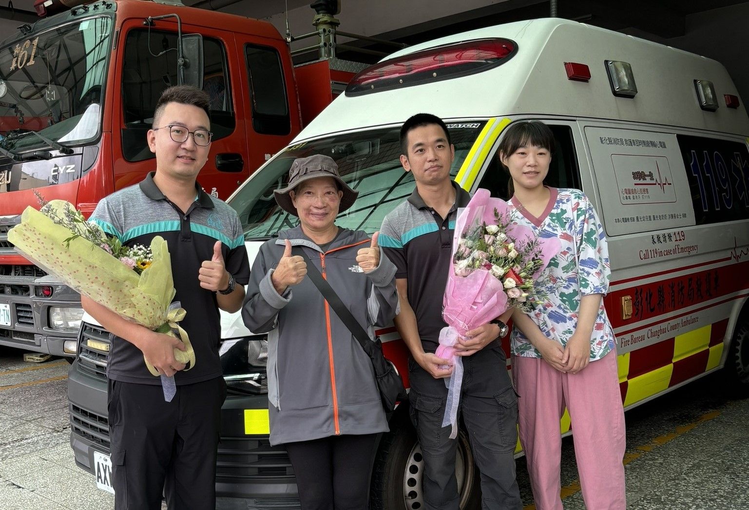 彰化和美鎮一名陳姓女子上月騎機車送便當到和美消防分隊途中,不慎自摔,當場失去生命跡象,和美分隊2名高級救護技術員及秀傳醫院護理師趕赴現場急救,陳女歷經兩次OHCA(到院前心肺功能停止),幸好急救後成功恢復心跳呼吸,在醫院治療後順利甦醒,14天後康復出院,陳女感念救命之恩,今(11日)前往分隊道謝,並送上烤雞,彌補那天「沒送到的便當」。