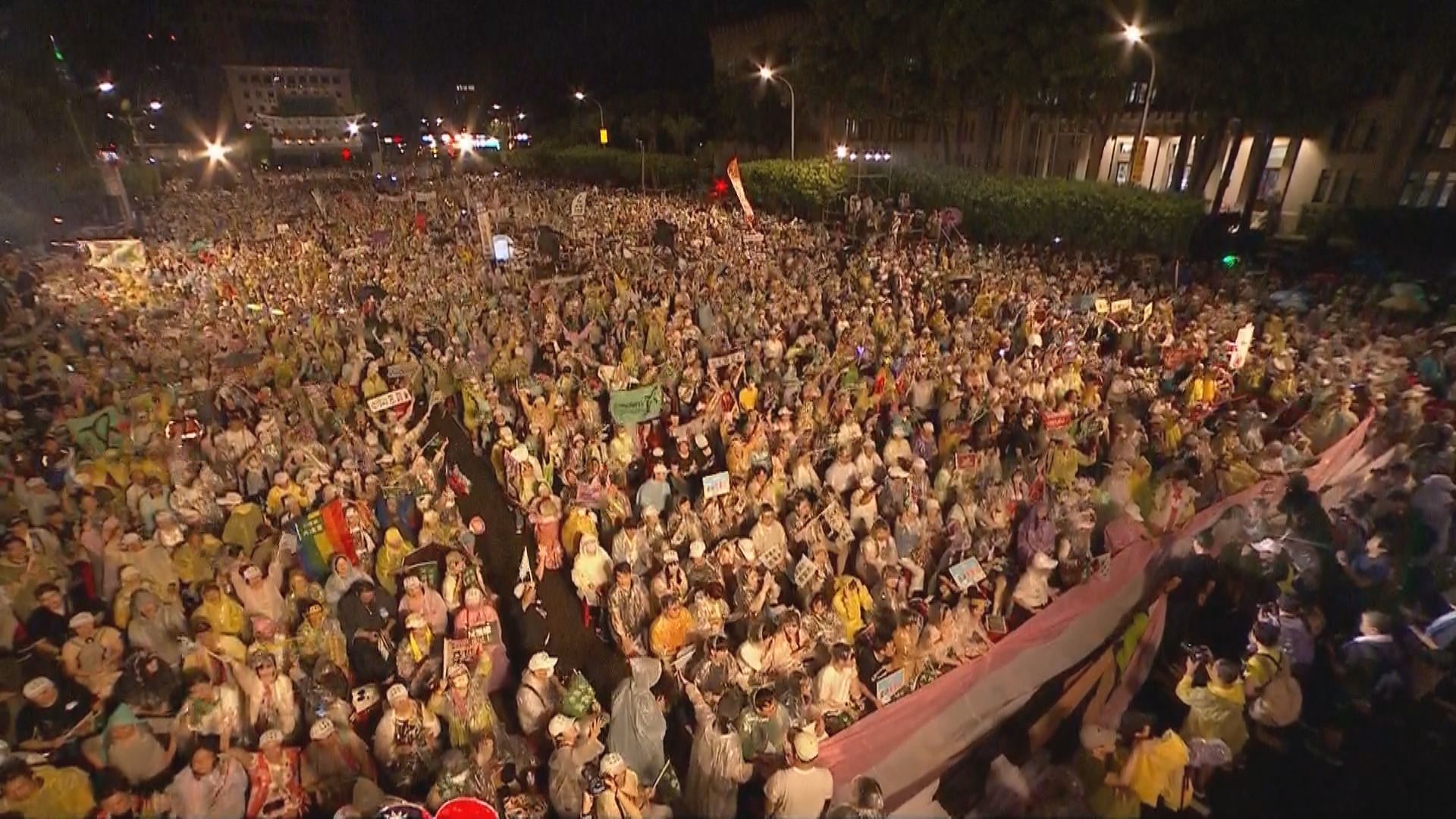主持人 阿美:「今天來到現場的朋友,已經超出景福門兩旁,來到十萬人了。罷免投同意,台灣需要你。」726出門投票布條飄揚凱道,人潮從總統府到景福門,一路向周邊延伸,即使大雨狂下,這最後一哩路,挺罷支持者都沒離開。
