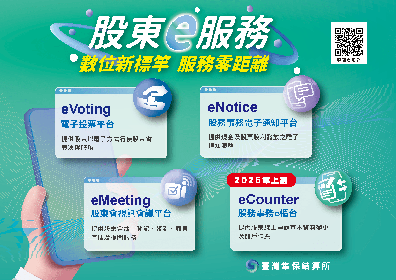為實現高效低碳的資本市場,集保結算所整合一系列的股務數位化應用場景,包括eVoting電子投票、eMeeting股東會視訊會議、eNotice股利發放電子通知,以及eCounter股務事務e櫃台等,打造全方位一站式的「股東e服務」平台,建構完整的股務數位服務生態系,邁向ESG永續發展的嶄新里程碑。