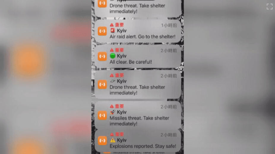 鏡新聞特派記者吳洛瑩以及翁啟斌,人現在就在基輔,他們在第一線親身經歷了整晚空襲警報的真實狀況。吳洛瑩的手機接連跳出空襲警報的訊息,說是有無人機的攻擊或是有飛彈的威脅,要大家趕快躲避。