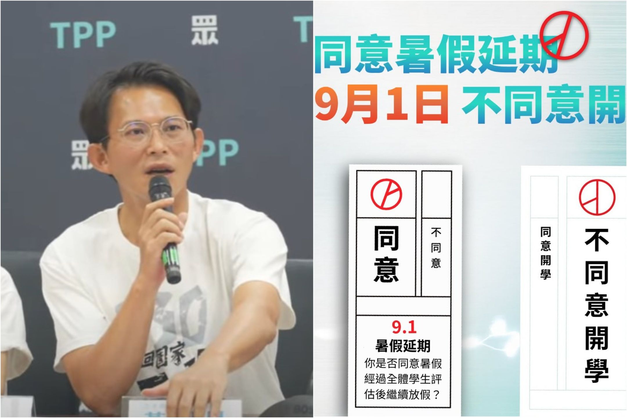 民眾黨青年部昨日發文,結合剛落幕的公投與即將開學的議題,指出在長達2個月的「暑假政策」中,學生族群出現3大正面變化:每日睡眠時間增加3小時、娛樂產業蓬勃發展、早餐店消費顯著下滑,幽默稱「要用選票守護暑假」、「讓學校的魔爪(誤)遠離學生」,並註明同意為「暑假延役到永遠」;不同意則是「被迫開學」。