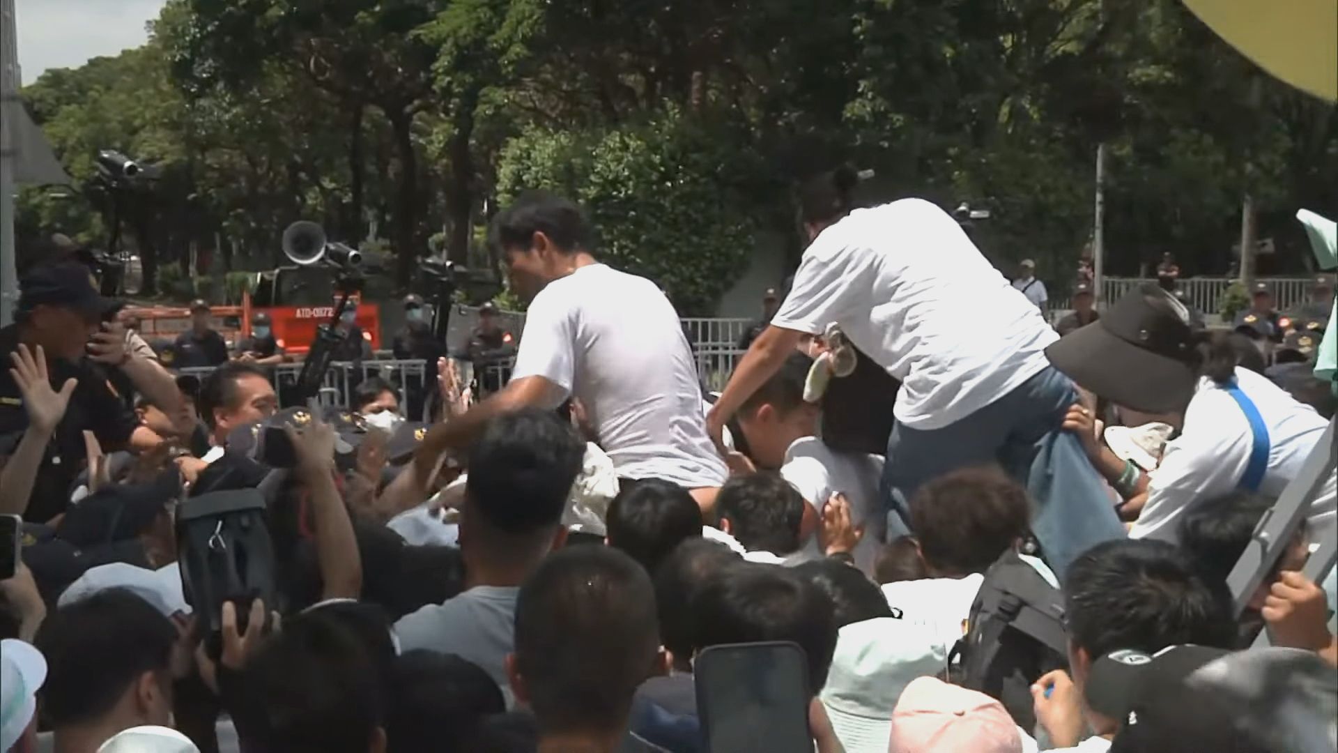 至11時19分,群眾推擠護欄,第一排拒馬應聲倒下,大批支持者衝破警方防線,高喊「警察後退」。部分民眾與黨務幹部,包括民眾黨立院黨團主任陳智菡、發言人張彤等女性黨工,相繼爬上拒馬,警方透過擴音器連番警告「很危險,不要攀爬」、「請女警保護!小心!小心」。