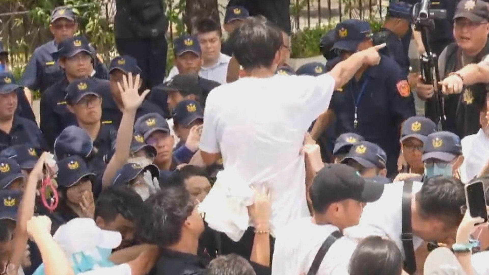 擔心衝突升級,警方先一步阻止民眾黨宣傳車開進封鎖線,沒想到民眾黨公職越罵越大聲。民眾黨公職:「警察暴力,警察離開」。明明是集會遊行禁制區被攔下來,卻比警察還大聲,甚至民眾黨隊伍中還發現一名男子穿著印有五星旗的衣服,被網友批評,難道是統戰宣傳。